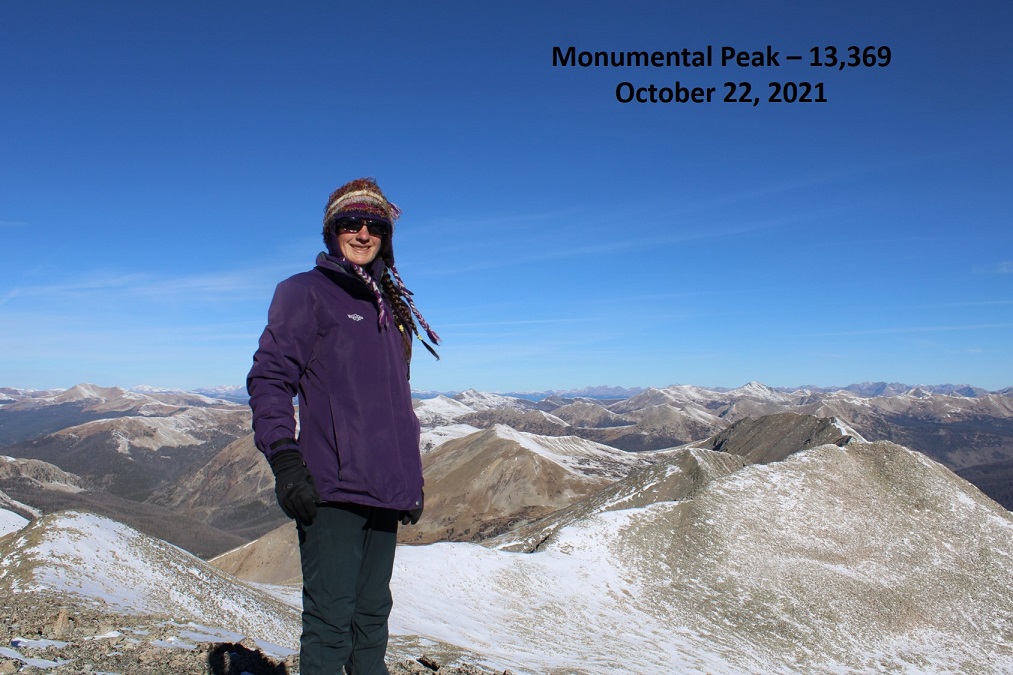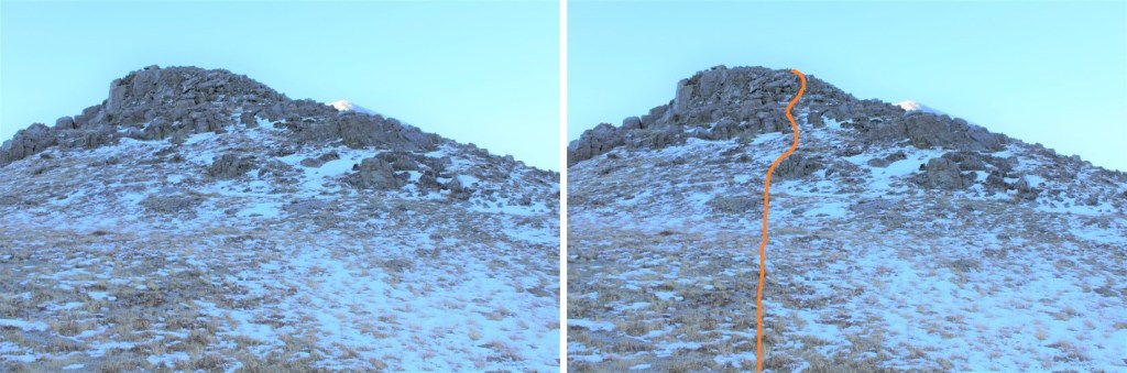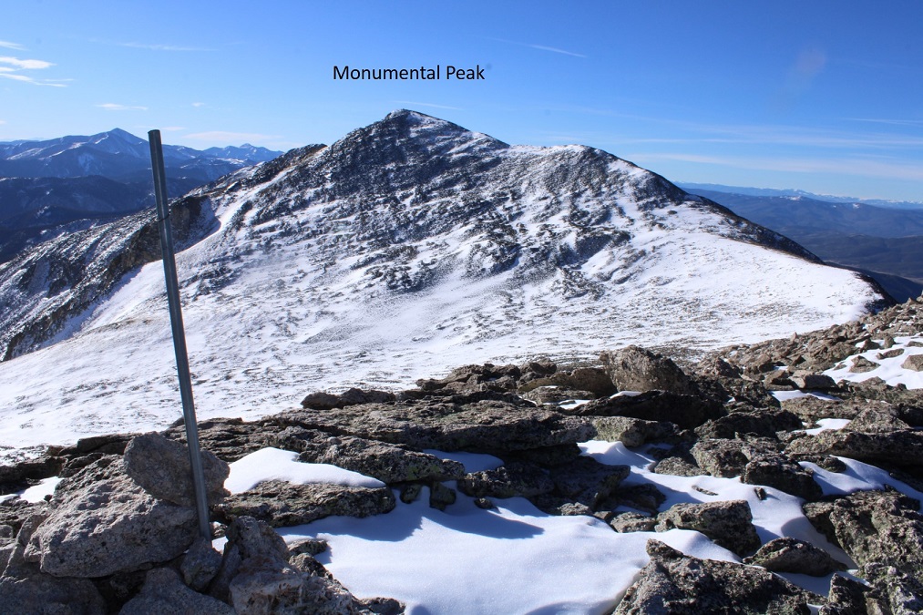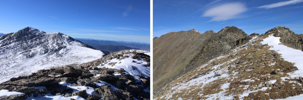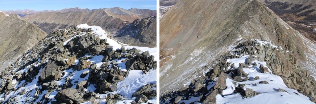 This is normally a class 2 ridge, but today, due to the snow, there were class 3 areas (on all the ridges with snow today). I continued following the ridge, being mindful of loose rocks and voids beneath the snow. From the ridge I had great views of all 4 peaks I’d be climbing today