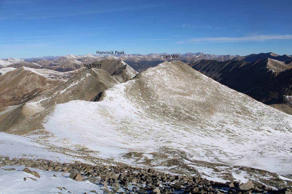 I followed the ridge north, losing about 275’ in elevation towards the Van Wirt/Hancock Peak saddle, once again, being careful where I placed my feet with the rolling rocks and snow (all still class 2).