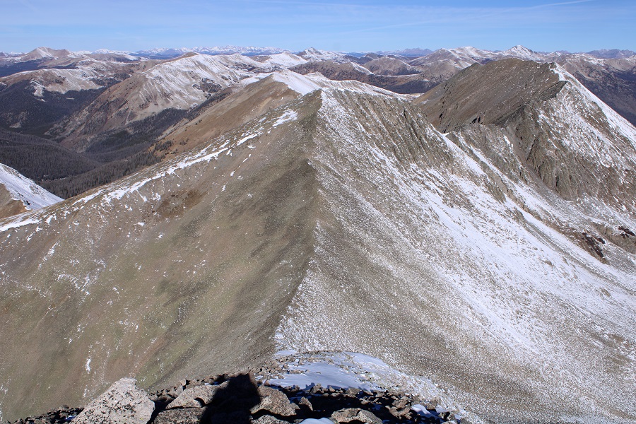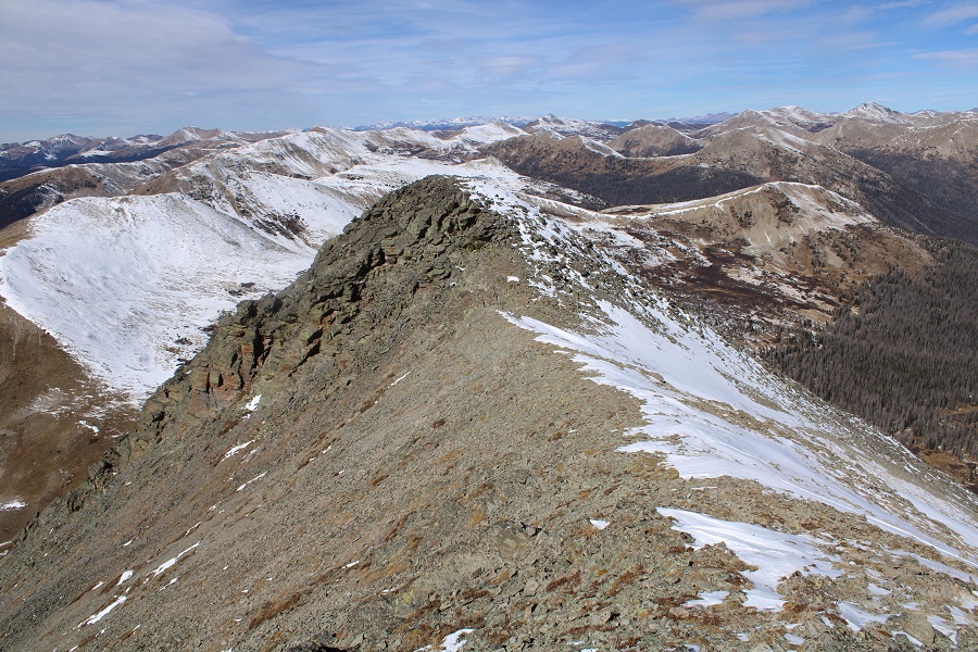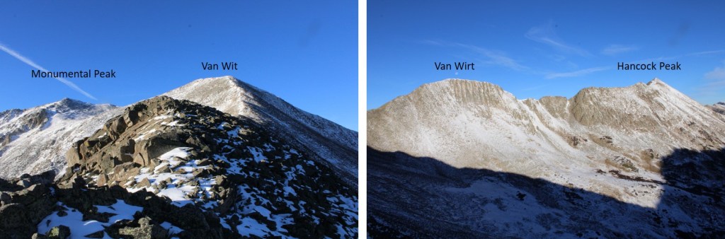 Back at the summit of Van Wit, I now followed the ridge northwest, towards Van Wirt. Due to the snow, this was class 3. I took a lot of time carefully navigating the rocks and snow on the way down, losing about 620’ of elevation.