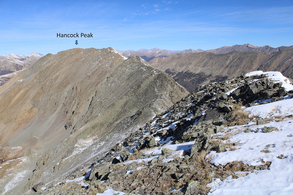 I was headed towards Hancock Pass. At the end of the ridge, just before losing elevation, you can see the pass