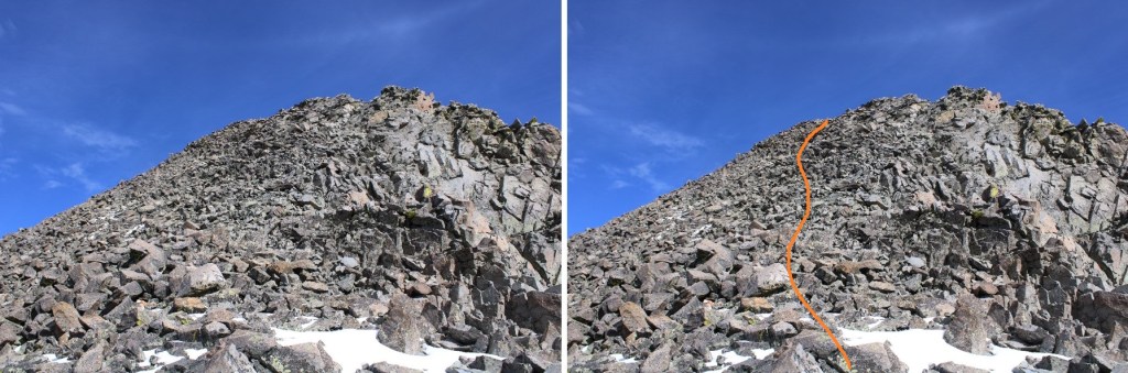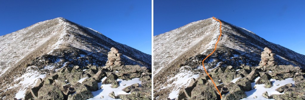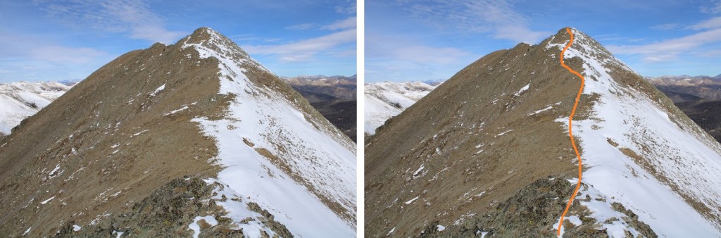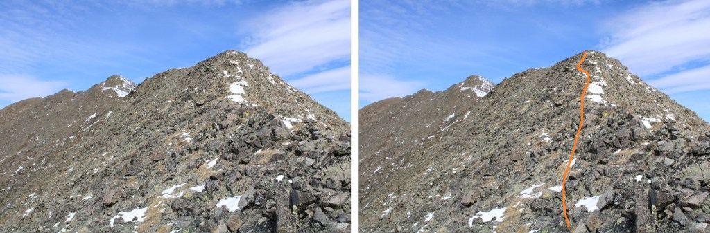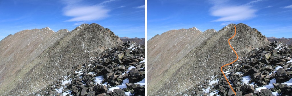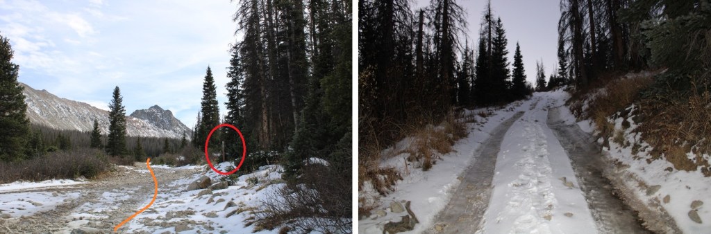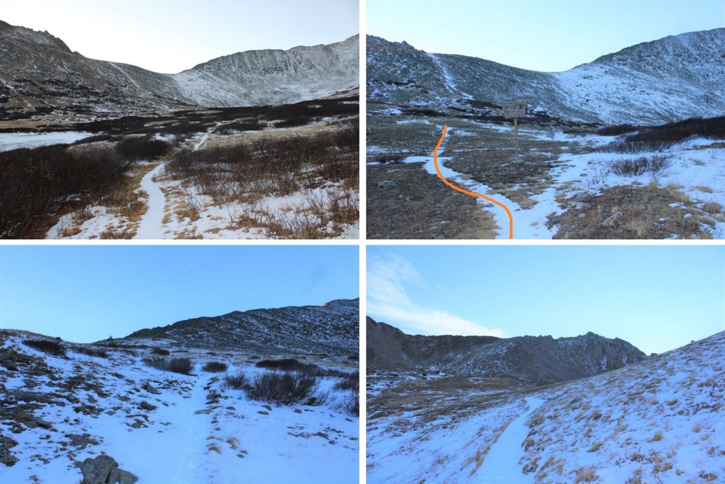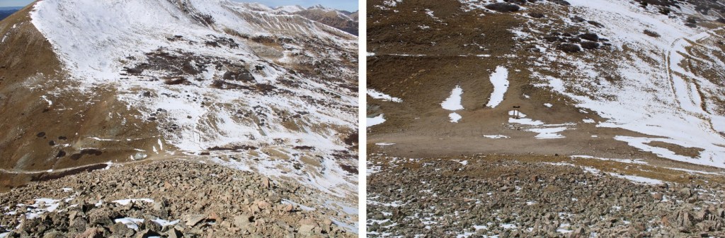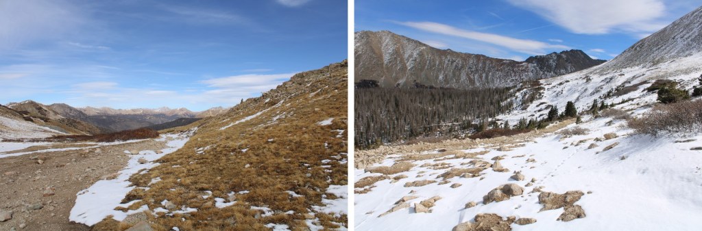Here’s the route up to the pass, all class 1, sprinkled with snow. At the junction, take the trail that goes left, towards Chalk Creek Pass.