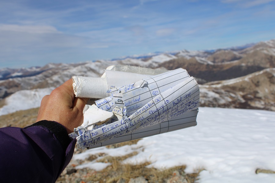 There was a torn-up summit register hidden in the cairn. The last person to sign was here over a month ago.