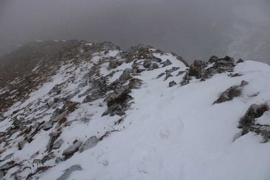 I descended to the saddle, and realized the snow wasn’t going to let up any time soon. I could have made this a loop, but the pictures would have been useless in a trip report, and navigating a fresh layer of sugary snow on the rocks didn’t sound like a fun time, so I decided to just head back the way I came, making this an out and back hike. I’d come back later for the other two peaks.