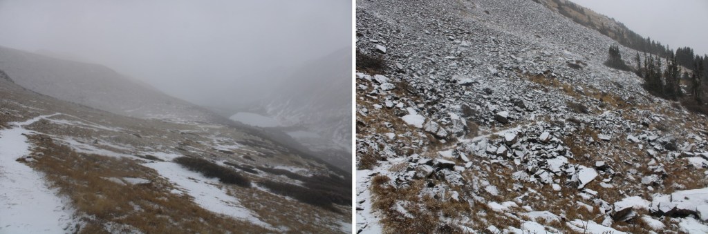 It finally stopped snowing just as I made it back to the trailhead, but a look up at the peaks let me know it was definitely still snowing above treeline.