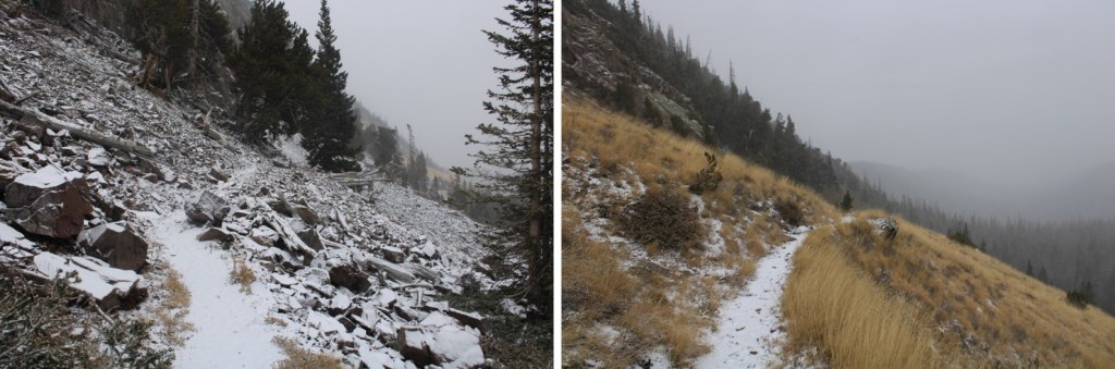 Here are some pictures from the hike out. It was neat having more snow on the trail on the way out than I’d had on the way in. The only downside: There had been ice on the trail this morning I could avoid because I could see it. Now it was covered in a layer of snow and not quite as visible. I did some slipping and sliding, but managed to remain upright.