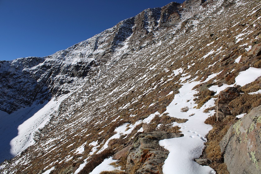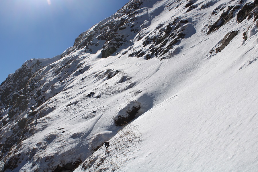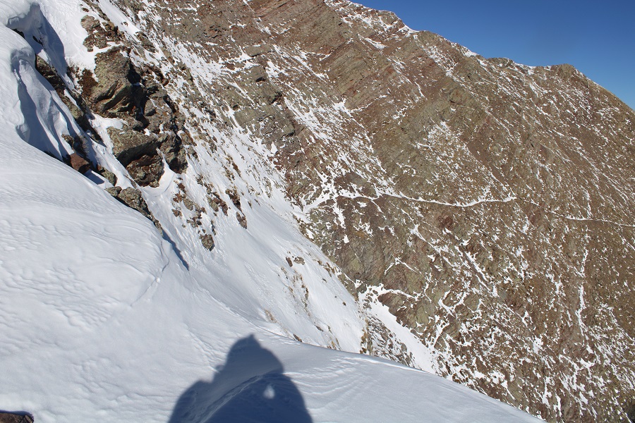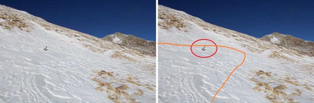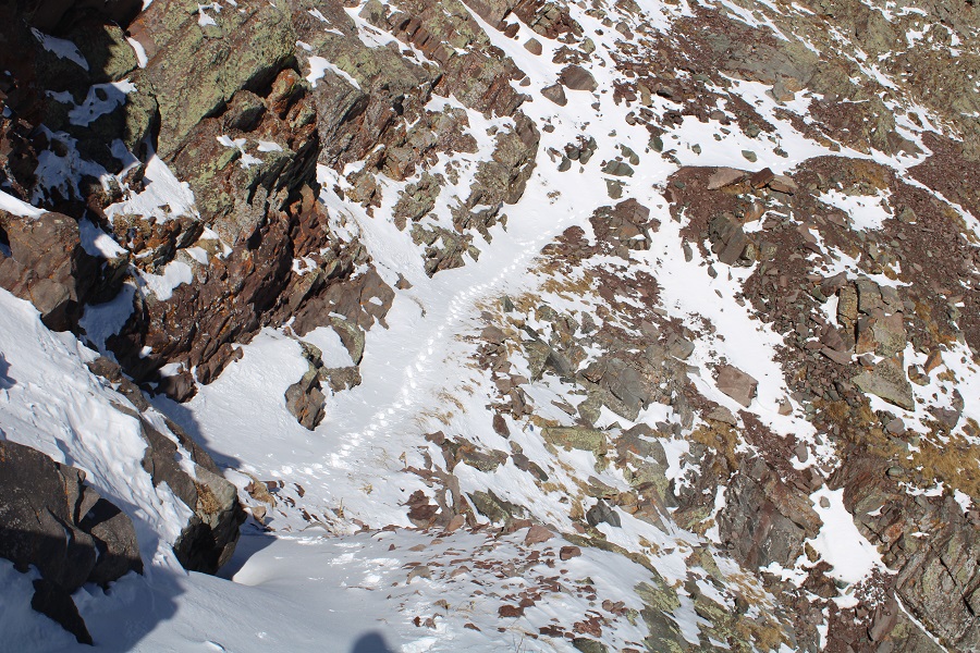 I was about 200 feet from the pass, and the snow drifts were now taller than I was. I kept seeing snow slide down below my feet, over the cliffs, and made the decision to turn back. It hurt to turn back, but I knew it was for a good reason: I’m out here solo, and while I might have made it past the snow/cornice to the pass, I couldn’t have done so safely, and a fall would have been fatal. The red arrow is where I turned around. You can see the tracks where I stopped