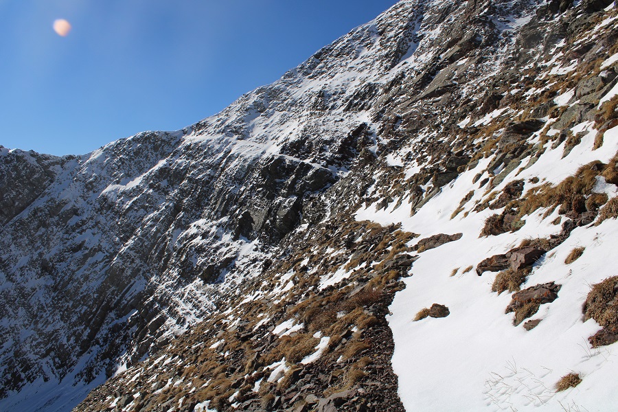 It was slow going, and I had to spend a lot of time making a solid path in some areas through the snow, doing my best to hug the cliff, not entirely sure how wide the trail was. I was doing find until I got to this area: