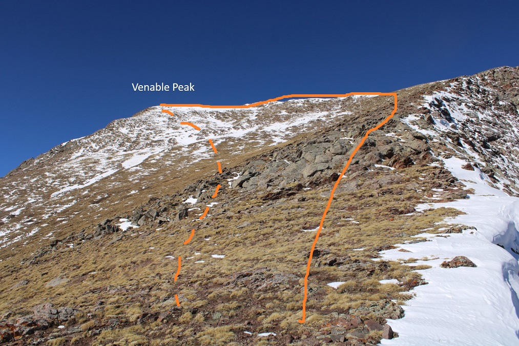 For those of you interested in taking this route, this is how I summited Venable the next day. I took the solid line up, the dotted line down. Both were class 2 (although the ridge had quite a bit of snow)