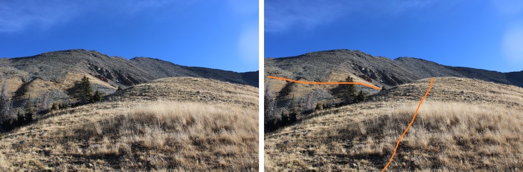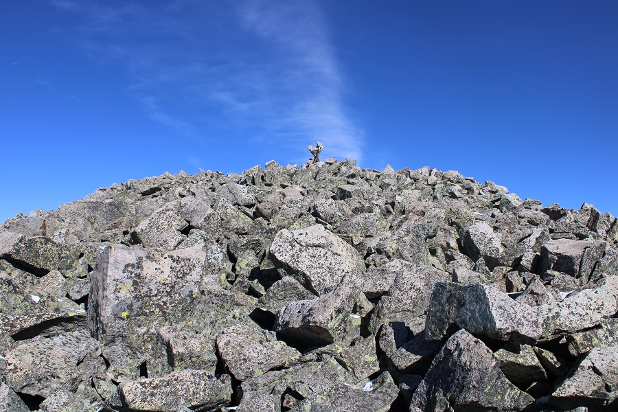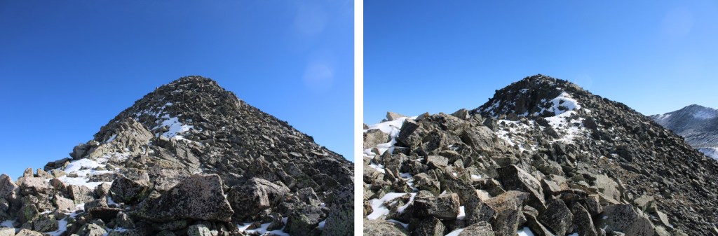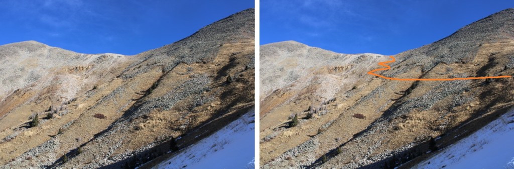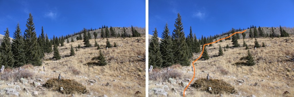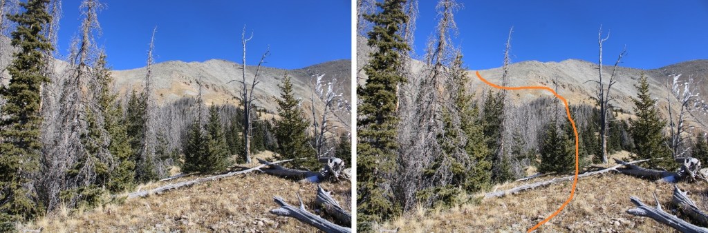 At the top of pile of rocks I was now just at treeline, and on a ridge. I followed the ridge east, and then north, staying directly on the ridge.  Here’s an overall view of the route.  There were cairns here.