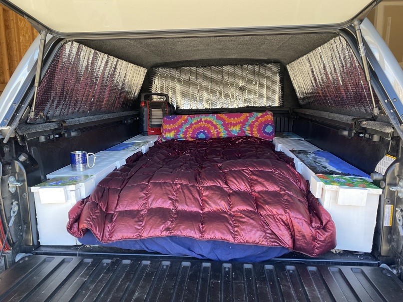 For those of you who’ve been following my truck situation, the topper for Miles finally arrived!!!  More than 4 months later, but let me tell you, it was worth it!  I’m so glad I did a trial run with my last truck (‘Truck Kirk’… if you get it, you’re awesome, and we should be friends), and got everything I wanted this time around.  This weekend was my first time trying out the new set-up, and I’m thrilled.  Plexiglass instead of glass gives me blackout windows, which are great for irregular sleep patterns that are sometimes necessary to wake up at 2am and hike.  Added bonus:  plexiglass doesn’t shatter! I put up Reflextrix around the windows to keep in the heat, and set up my Buddy heater in the corner.  I re-used the foam bedding from the Tundra (after cutting it a little to fit), built the cabinets myself (not bad considering the only ‘shop’ experience I have was in a 7th grade Industrial Arts class), and commissioned my daughter to paint them.  She used pictures I’d taken while hiking, and all I have to say is I love them!!!  We left a few of the lids to the cabinets blank, so if we meet at a trailhead, I expect you to add your signature to one of them so I can remember you.
