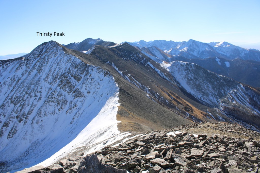 From the saddle, it was a class 2, rocky ridge hike to the summit of Thirsty Peak. I gained just over 500’ from the saddle to reach Thirsty Peak (unranked).
