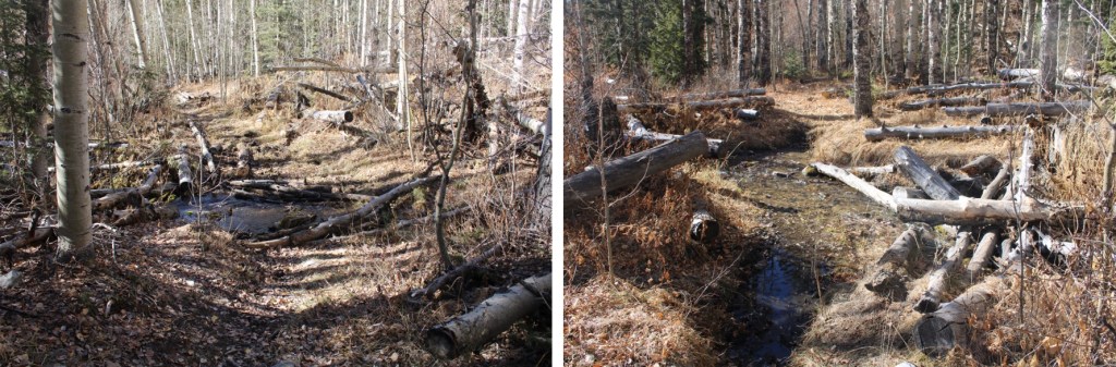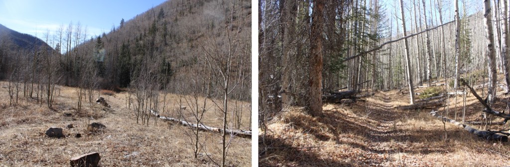 I passed some camping spots with hunters still sleeping in their tents, came to a bit of a clearing, and had a visual of where I was aiming; the saddle between PT 13123 and Thirsty Peak.