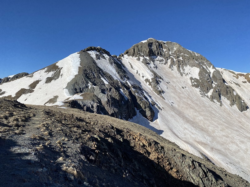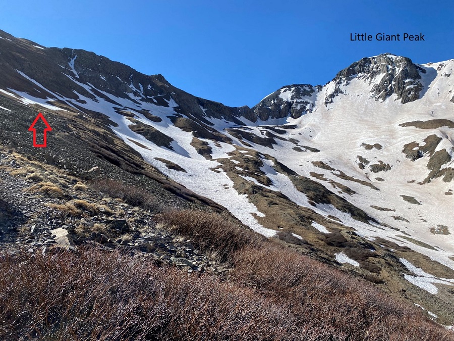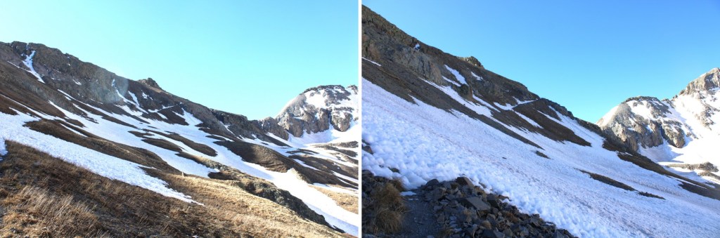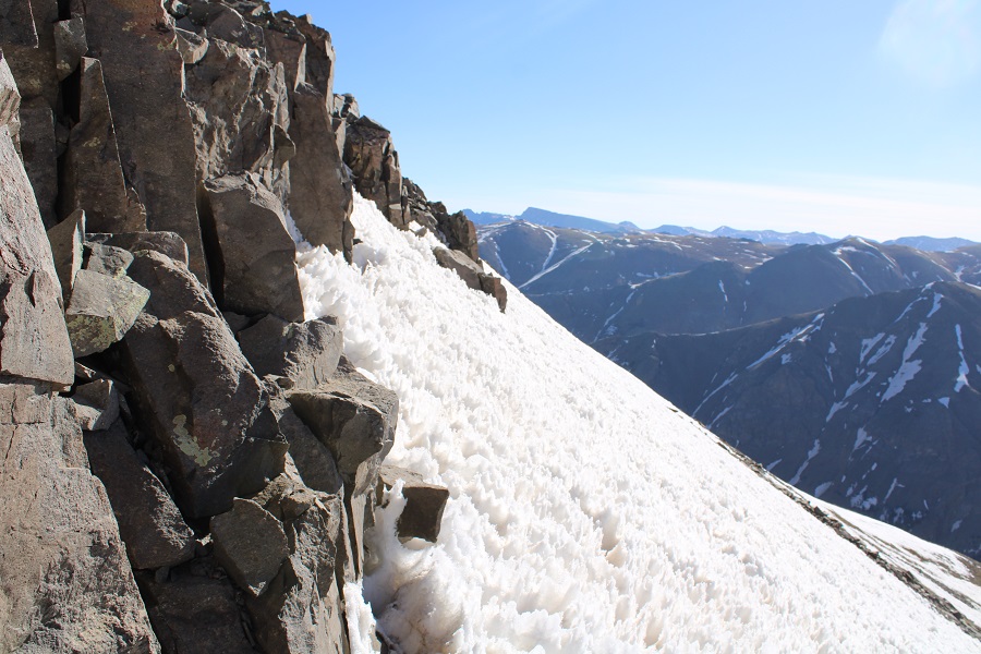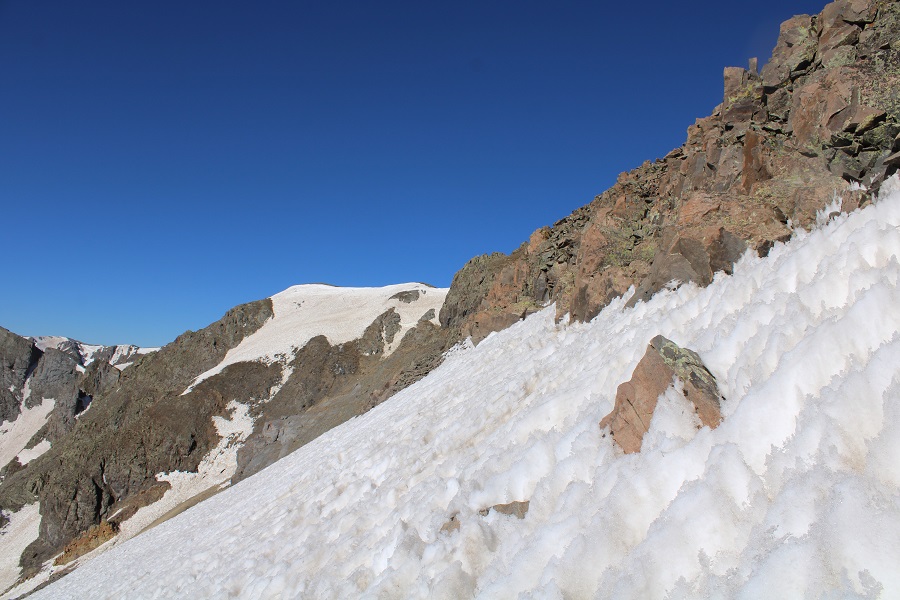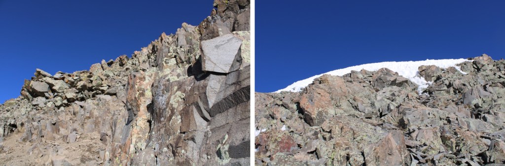 When I made it to the top of the scree, I came to a rocky area. I decided to go up and over the rocks, which was an easy class 3 scramble, but when I got to the end, I was met with snow and terrain I couldn’t downclimb, so I had to backtrack. Instead, go around the rock outcropping to the left. I was met with snow, but it was traversable.