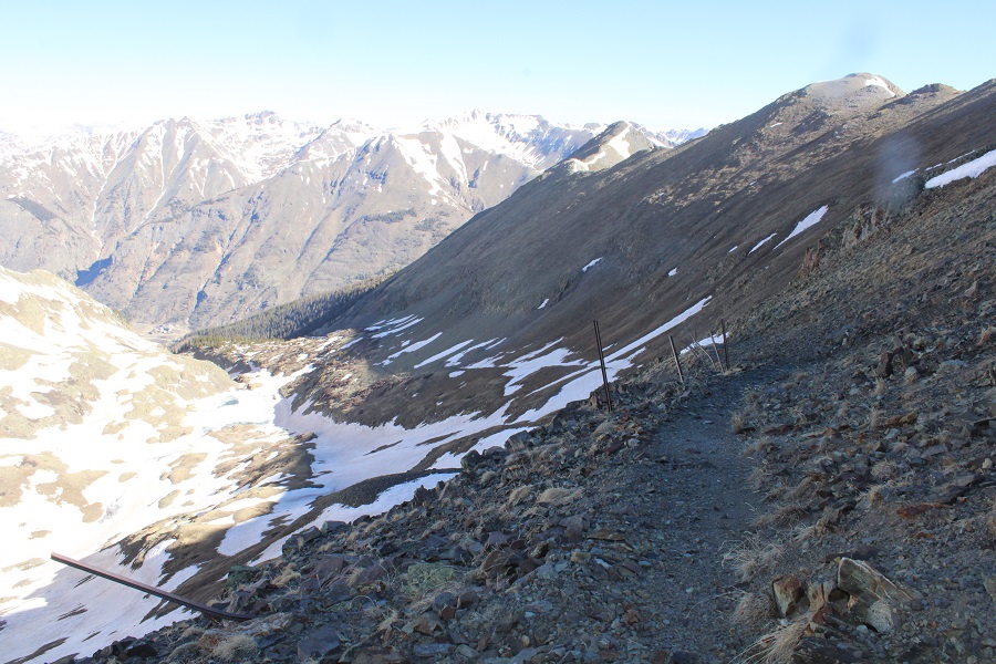 Once in the basin, I was able to see a trail to my left. However, due to the snow, there was no start to the trail. So I put on my microspikes and aimed for the trail in the distance, which took me to a pass.