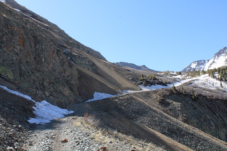 From CR2 near Silverton I turned right on 52 (just about where the Mayflower Mill Mine is) and followed the road to 9950’. I could have continued on to a campsite at 10900’, but at this time I didn’t know it was there. I was glad I’d stopped at 9950’, because the road was narrow, and there weren’t any spots to turn around before the second site. Also, that’s the farthest you can drive at this point (10900’) as there are downed trees and snow blocking the road to the Big Giant Mine.