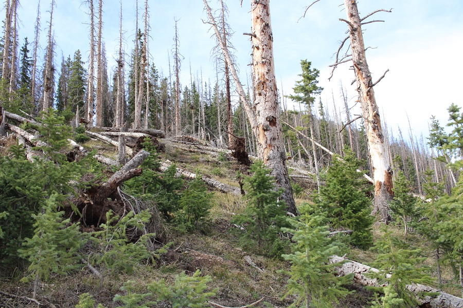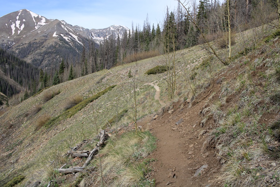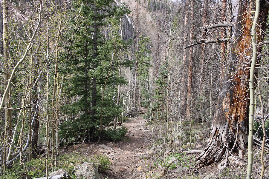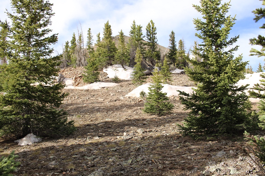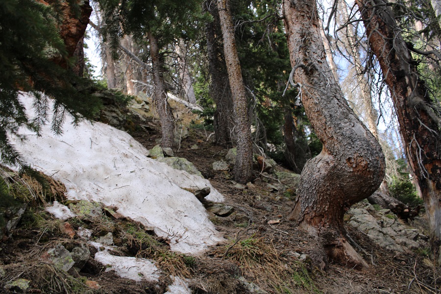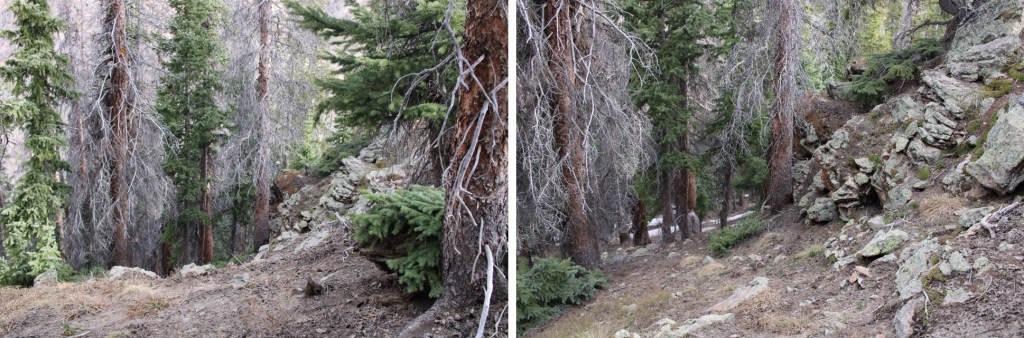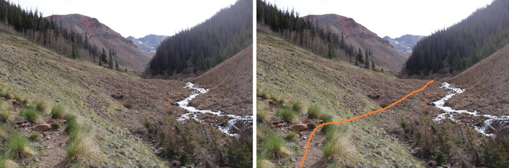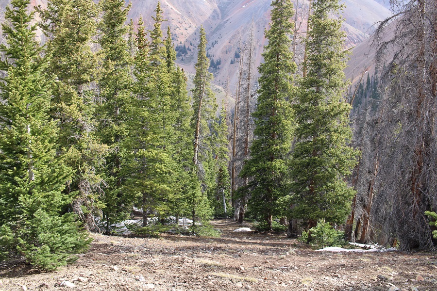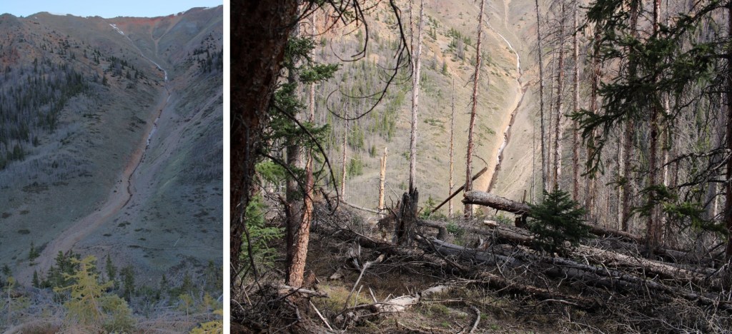 At around 11300’ of elevation, I left the trail to head down towards the creek. I left the trail where an obvious, and massive, avalanche had occurred a few years earlier. There was a faint trail closer to the creek.