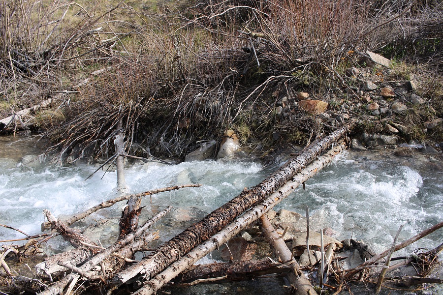 My goal was to cross the creek and head up Sundog’s north ridge. I crossed the creek near some willows, on a few logs that seemed to have been placed for just that purpose. On my way in, and on my way out, these logs were coated in ice, which made the crossing interesting.