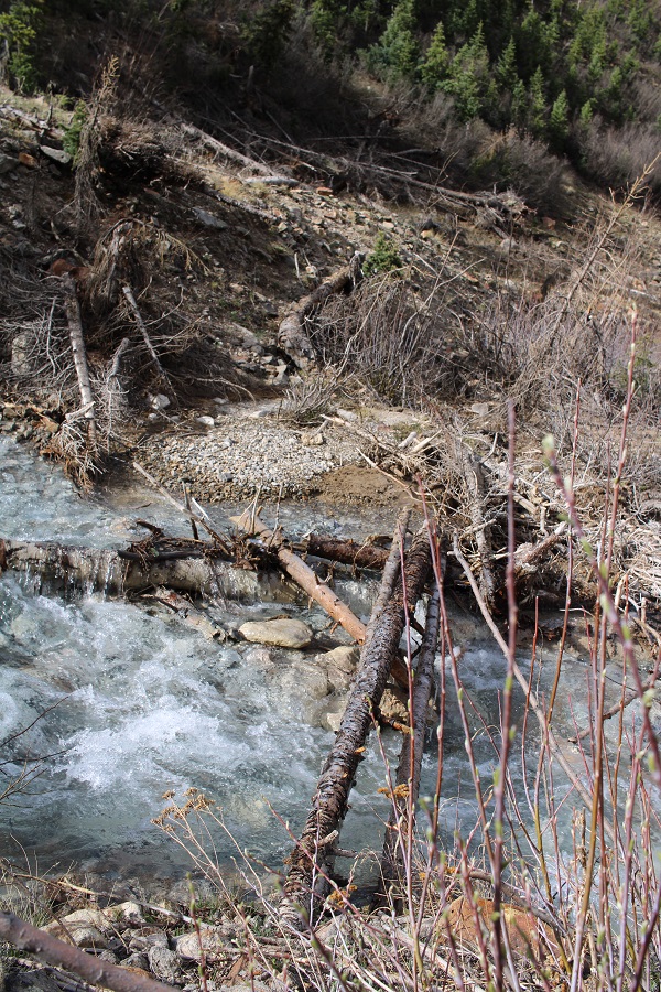 I noticed all the trees seemed to be leaning up, not down, which I thought was odd, until I looked behind me. It was obvious a large avalanche had occurred on the opposite mountain, which crossed the creek, and knocked over trees several hundred feet up the ridge I was now on.