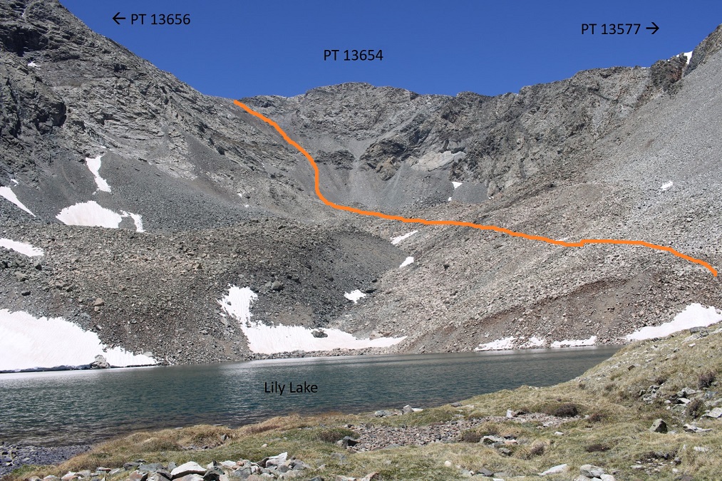 3: Summit 13577 and take the ridge to 13656 (I’m glad I didn’t end up needing to do this, as the ridge looked rotten).