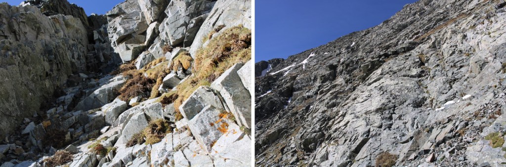 Here’s where I made another mistake. I tried to take a route to the left first, by following a dry couloir and what looked like a line filled with tundra/dirt. This was a bad idea. It started out as class 3, then sustained class 4 (for about 300’). I quickly felt out of my depth as it increased to class 5. I had a helmet, but seriously felt I needed a rope. I got to a place where it was decision time, and decided to descend those 300’ and try a different route. I knew I was close to the ridge, but could not justify the exposure and class difficulty. I reminded myself I had 3 potential routes for this peak, and an event I was speaking at tomorrow talking about managing risk and being a positive mentor to Girl Scouts. I did not feel I could continue on and still remain truthful tomorrow, so I backtracked. Climbing down was much more difficult than climbing up: I had to face the mountain and take it one step at a time. This entire side was sketchy. Please don’t use this route, especially since the gully can be kept at 2+. Here are some pictures of the route you SHOULD NOT TAKE