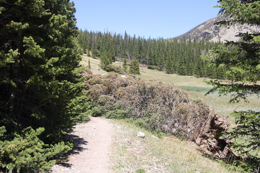 I followed the class 1 (minus the downed trees) trail to the Lily Lake cutoff, and turned right (the path to the left, that goes towards Lindsey, was blocked by a downed tree). This junction was 1.25 miles from the upper trailhead.