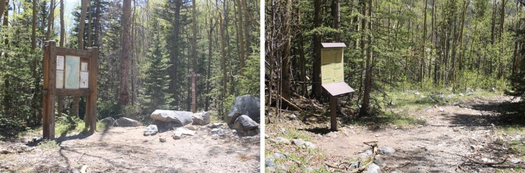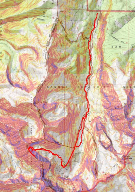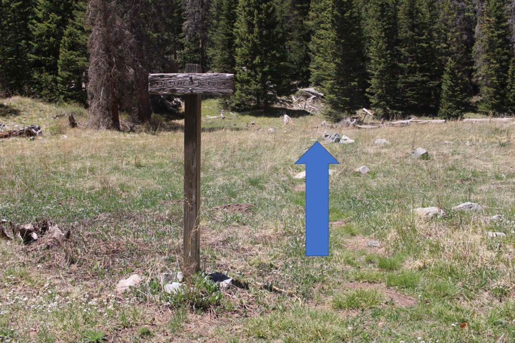 I then followed the trail to another junction, .2 miles away, which is where I made my first mistake of the day. The sign showed the Lily Lake trail as going straight, so that’s what I did, I continued hiking straight. But I should have turned off the trail and headed north at this point. You’d think, because I’ve been on this trail, I would have remembered this, but… I didn’t. I ended up hiking along a path that paralleled the Huerfano river for way too long before noticing my mistake. Here’s some advice: If you see yellow surveyors tape and are heading through avalanche debris but you’re on a trail… you’re on the wrong trail. The good news is they parallel each other, so if you head west, you’ll eventually connect with the correct trail. Here’s the junction and the way you should go: