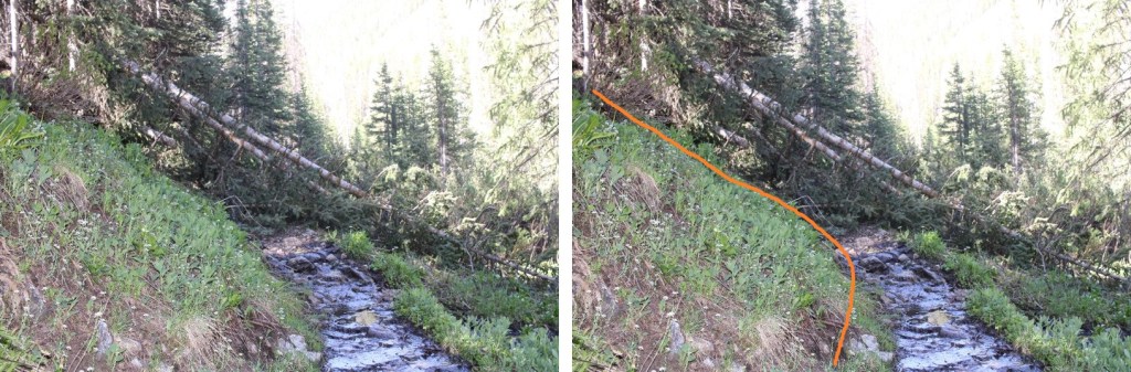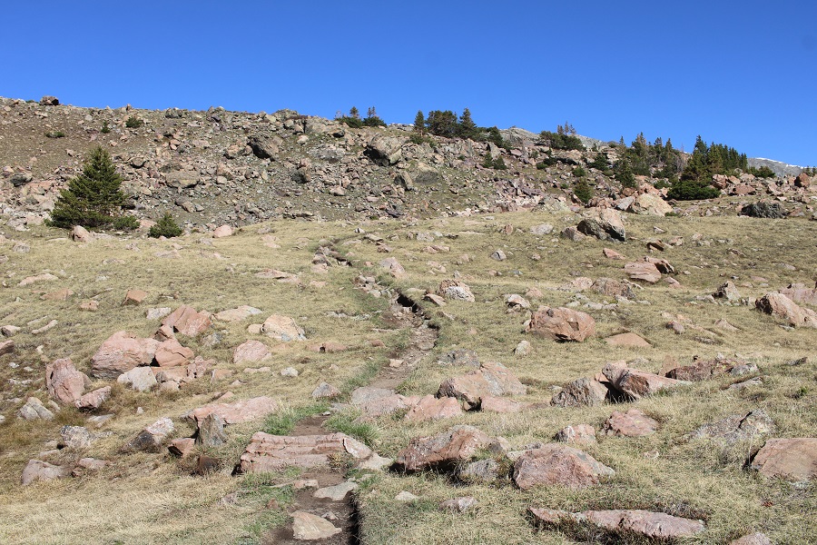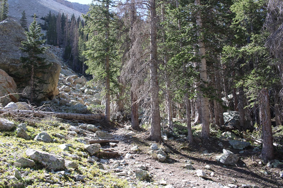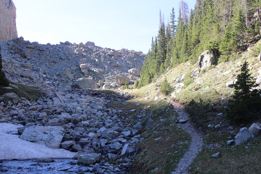 Until I had a problem following it south. This is where the fun route finding begins. Right where these trees cross the trail, turn left and go up the little waterfall trickling down. I was at 10720’ of elevation