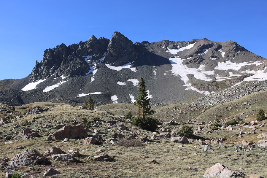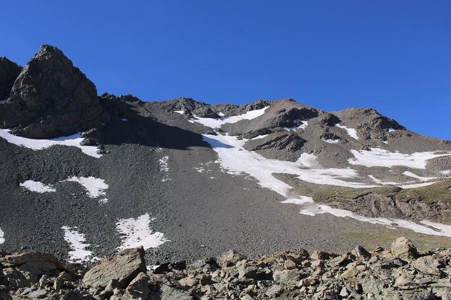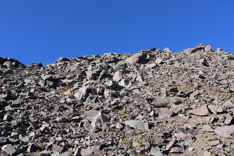 I left the trail at 11995’, and headed south. When I reached the bottom of the slope I put on my microspikes and headed straight up, following the line of snow. The scree here was rotten, definitely 2+