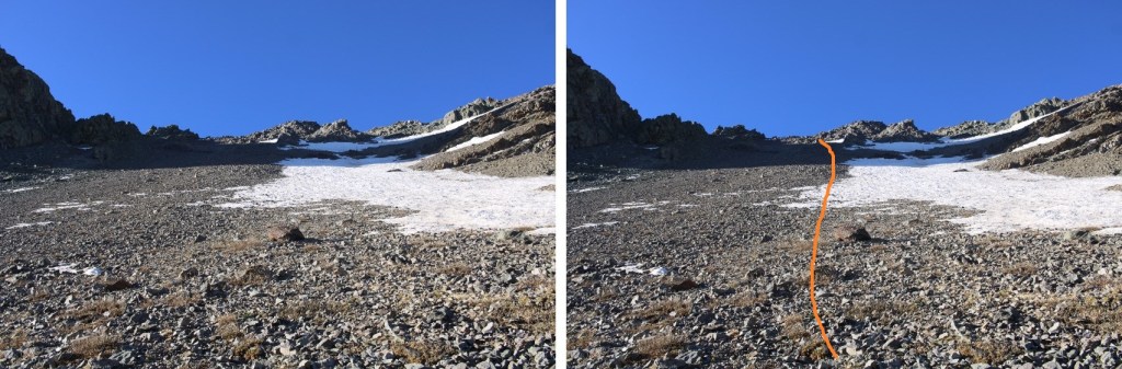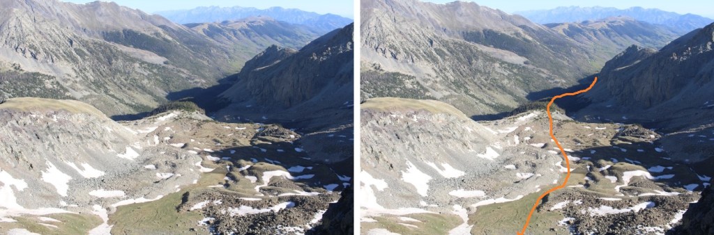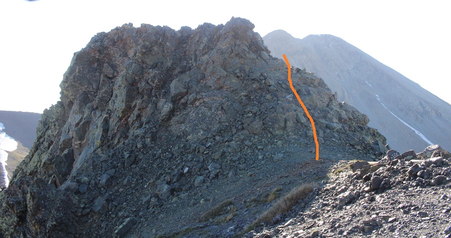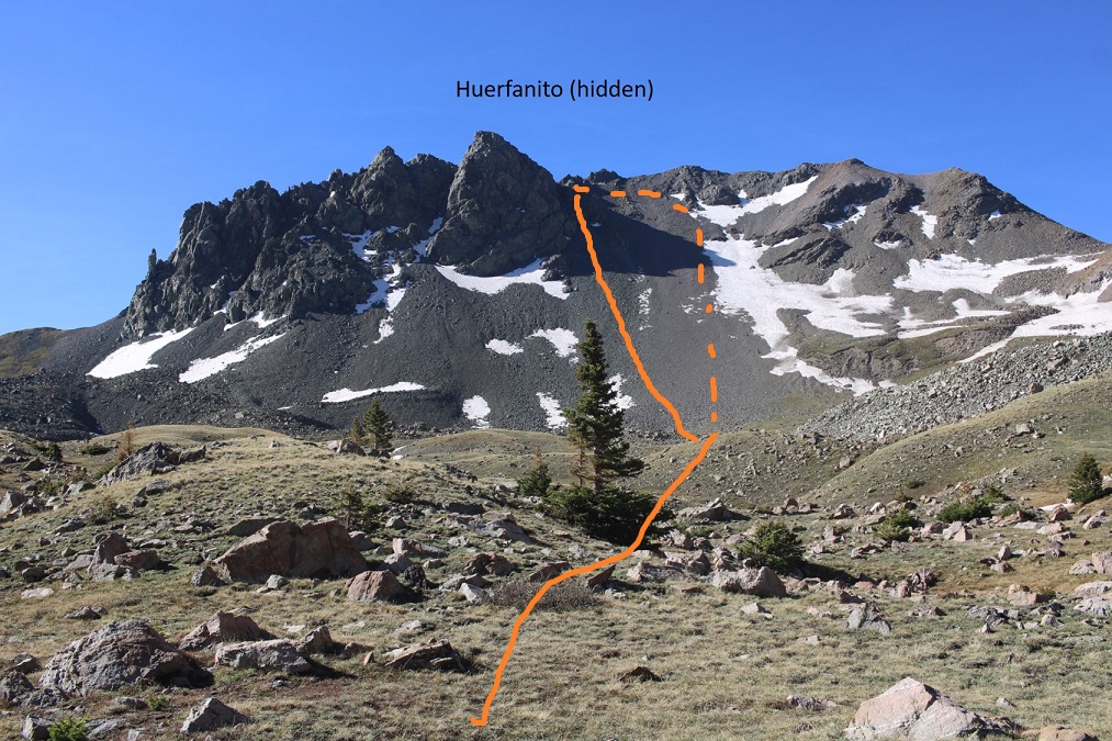 Here’s the route to took to the summit of Huerfanito from the upper basin. I took the dotted route up, the solid route down. If I had to do this again, I’d take the solid route up and back.