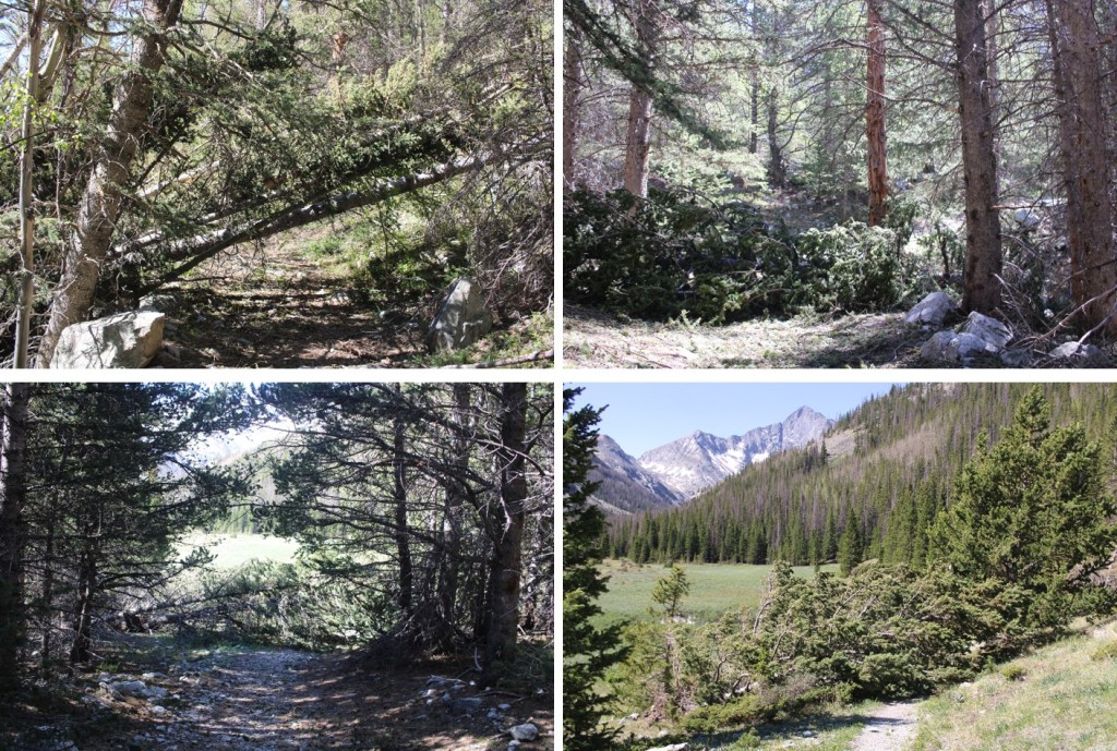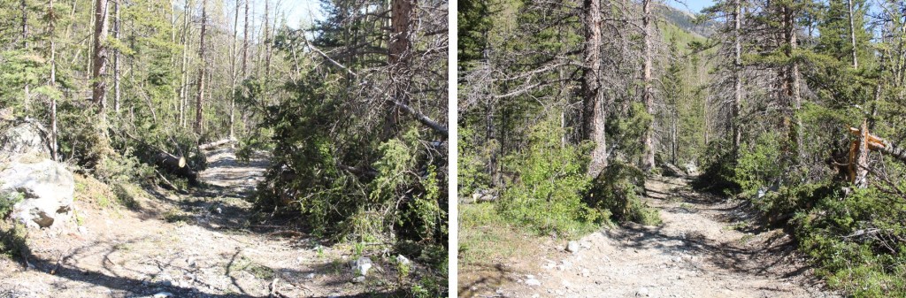 The road was clearer than it was 2 days ago, which I thought was suspicious, because I’d been in the area and hadn’t heard any chainsaws. The road was cleared almost right up to the trailhead, but the path was tiny. It looked like it was made just for ATVs, so imagine my surprise when I made it to the trailhead and saw a 4Runner and several trucks parked there (sporting Colorado pinstripes, of course).