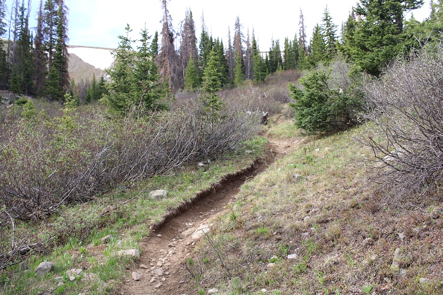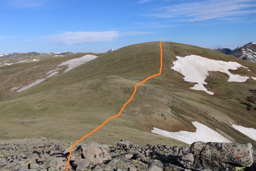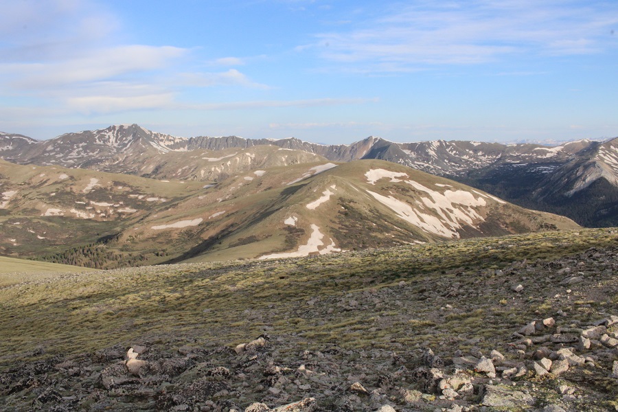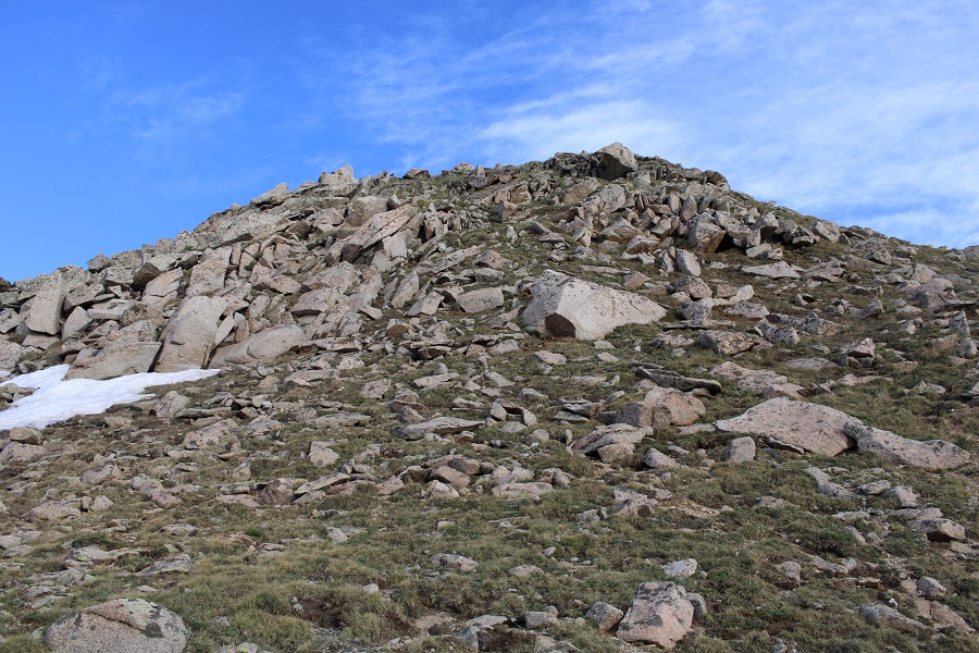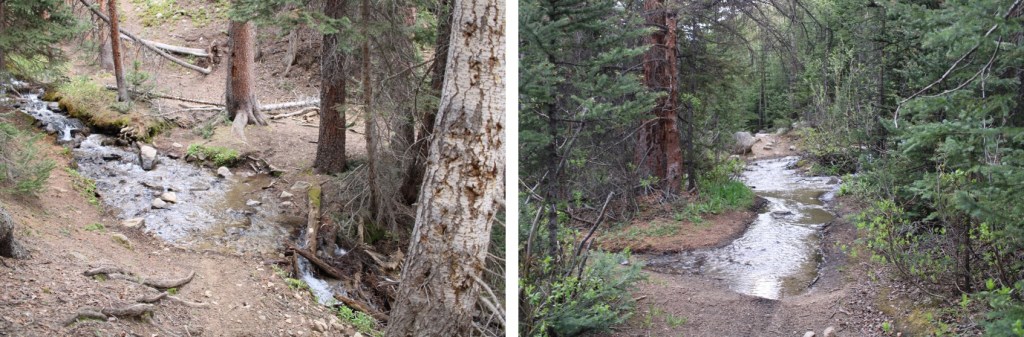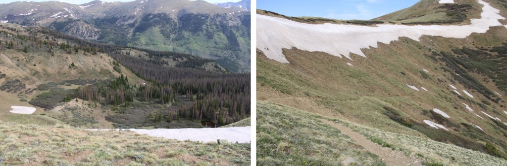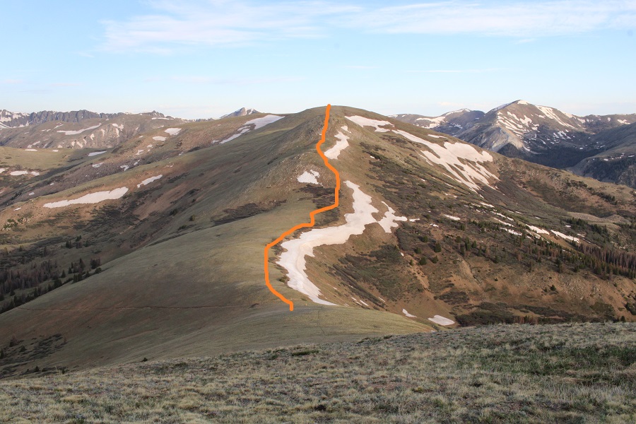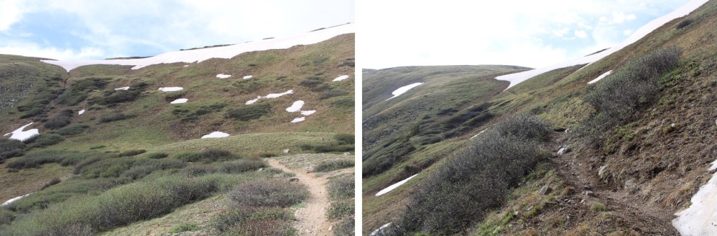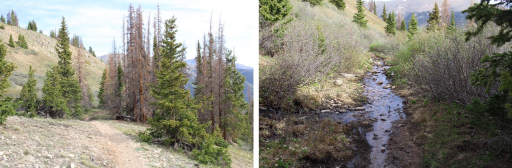 I followed the Green Timber Gulch Trail all the way to treeline and to the 12,837/13,078 saddle, for 3 miles. This is a class 1 trail, with a few minor creek crossings. It’s currently spring conditions, so there was a lot of water on the trail. There was a lot of moose scat on the trail (I mean, a lot), but no tracks, so I’m assuming the moose has moved on. This is also a motorized bike trail, so watch out for bikes.