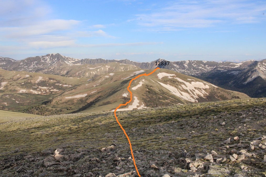 My next goal was PT 12837. From this height, you can clearly see the three false summits, which actually have more drop and gain than it looks like from here. This is the route I took