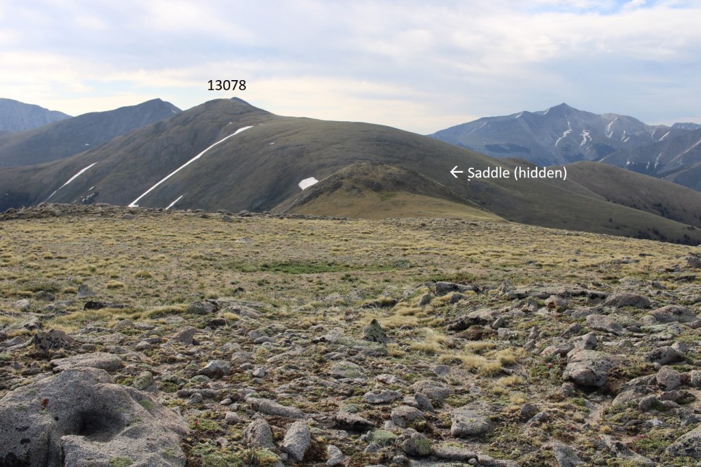Here’s looking back at the route from 13078, as well as my route back to the saddle
