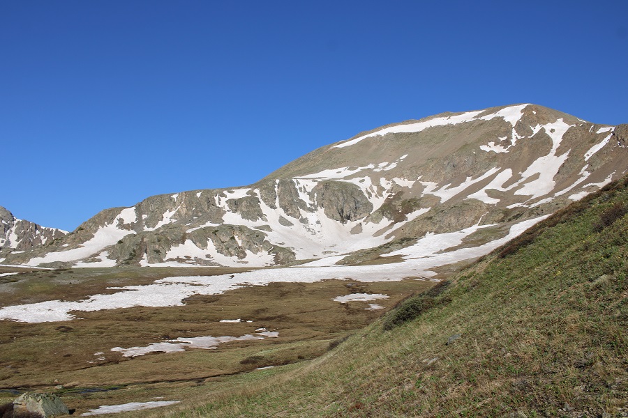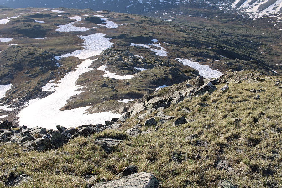 The upper basin was still melting out, and very… squishy. Once again, my socks and shoes got wet. I slogged my way southeast towards the saddle