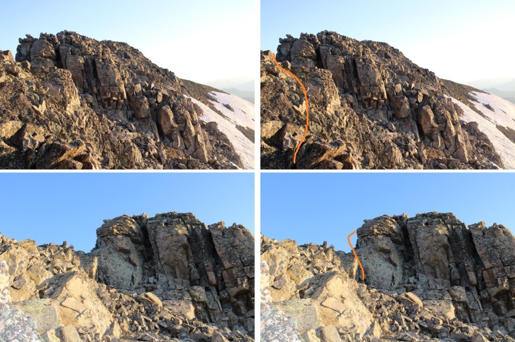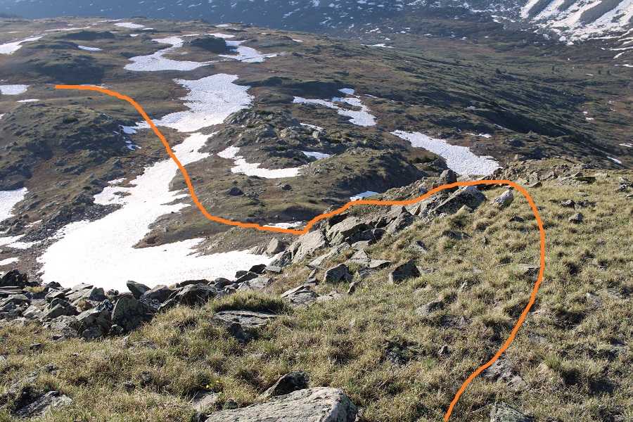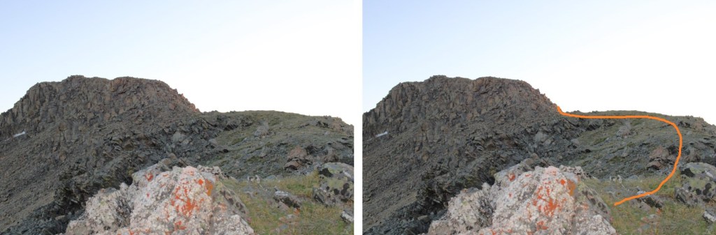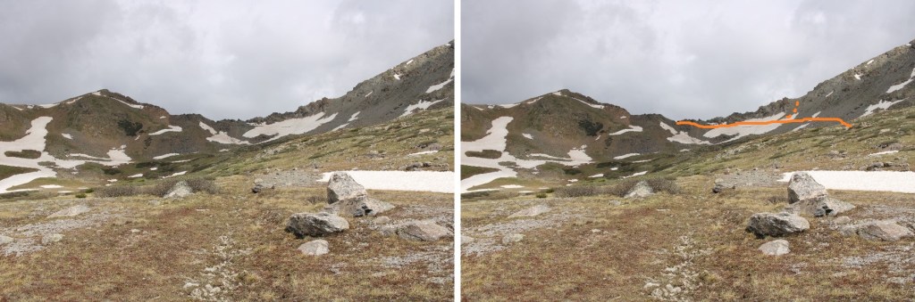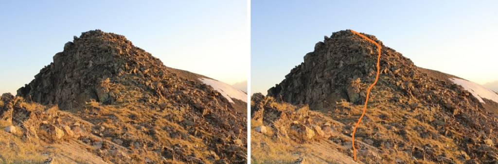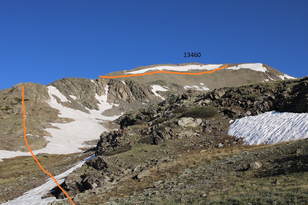 When I made it to the upper basin, my intent has been to take the trail to the saddle, and summit Prize Benchmark first.  The intended route is the solid route, the route I took is the dotted line.  Note:  the solid route wouldn’t work, because it was too chossy on the other side to utilize.