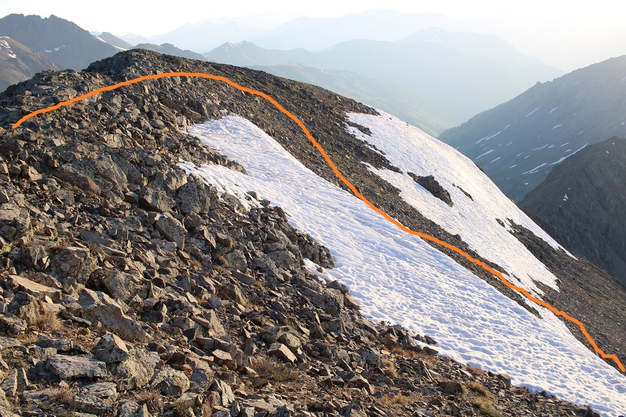 I didn’t have a good view on my way in of the snow conditions, so I walked southeast for a bit along the ridgeline to gauge the best descent route.