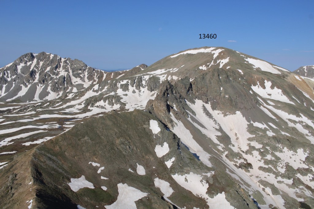 Now at the saddle, I turned and looked over at Prize Benchmark, but the route the rest of the way across the saddle looked sketchy.  It was loose, with spires and talus.
