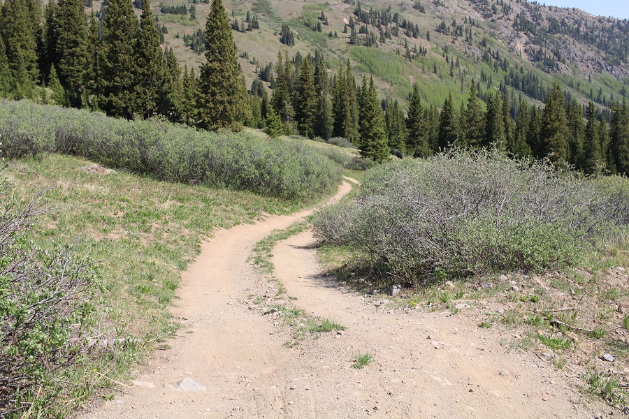 I followed the trail until it ended in the upper basin.  This is a class 1 trail, but it goes through willows and since it’s currently spring conditions, there was an excess of water running in the middle of the trail. With no way to avoid it, my feet became wet and muddy early on in the hike.