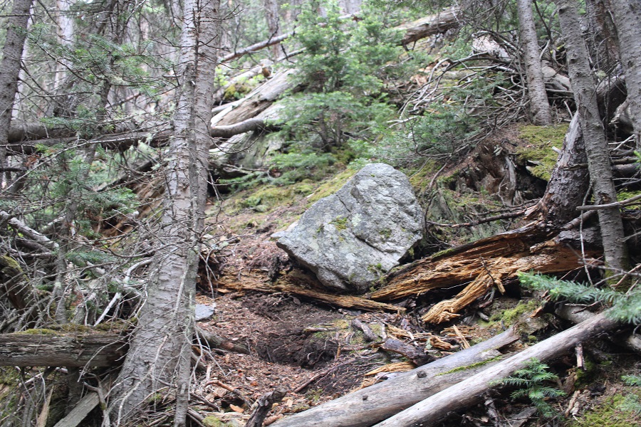 The creek had a lot of deadfall, but there is a faint trail that can be navigated.  I followed it until just after I saw this large rock formation on the left, at about 10630’.