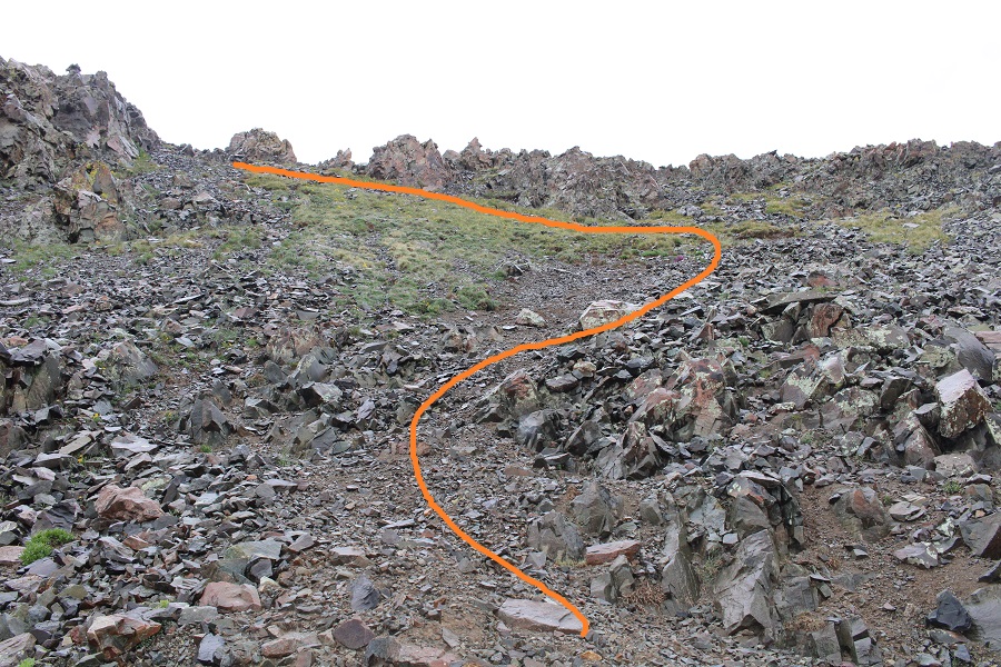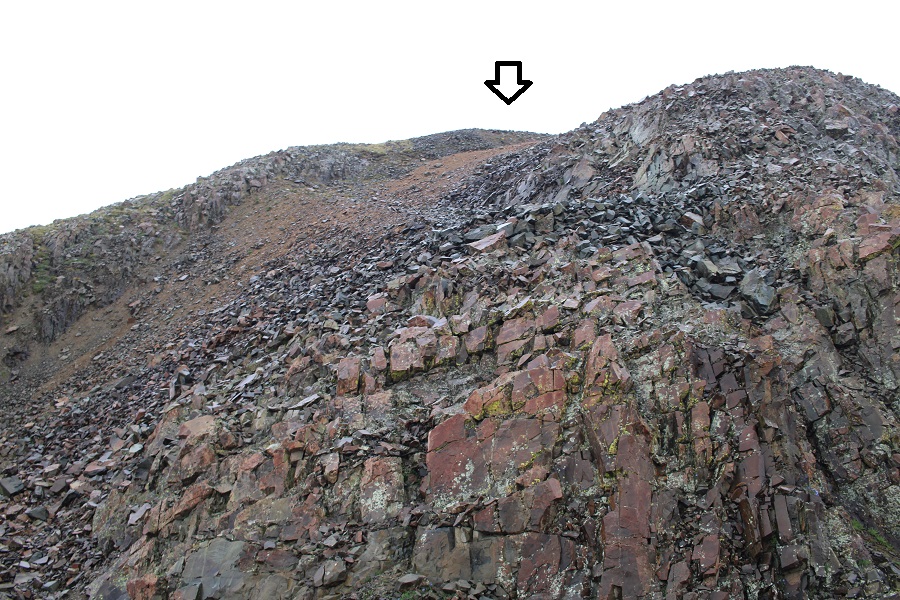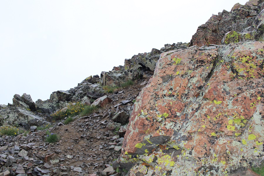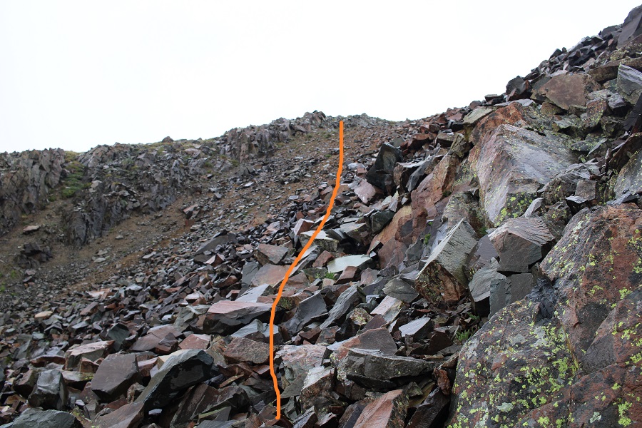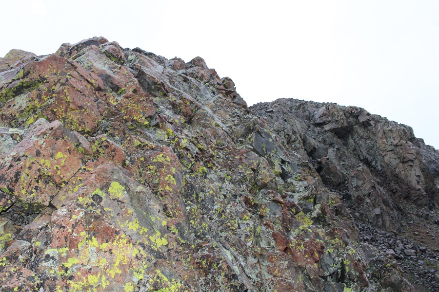 From here it’s a short trek to the summit.  Since it was raining the terrain was wet, and the scree was easy to ascend.  This was choose your own adventure, as all the gullies ‘go’. Here’s my route