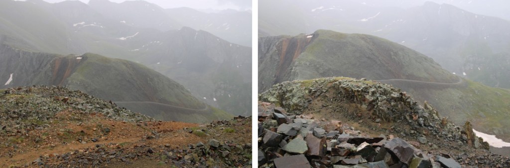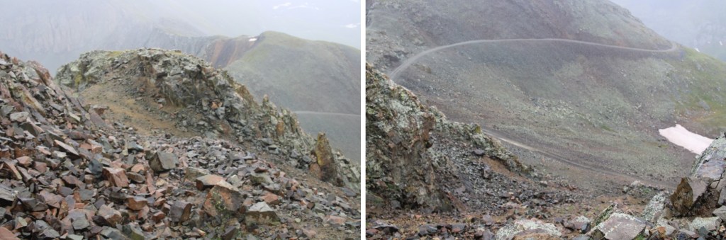 Even though the clouds were spitting rain, they didn’t look menacing and I wasn’t hearing thunder.  However, at the summit I felt a buzz between a few rocks and decided to get off that summit ASAP.  I ran down the wet scree, back to the road.