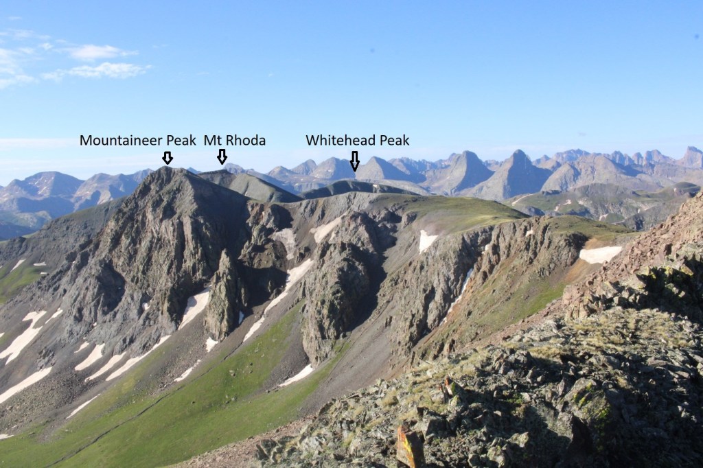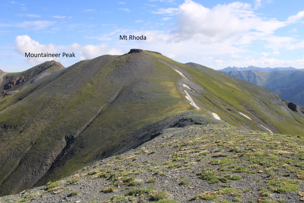 From the summit of Spencer Peak, you can see Mountaineer Peak and Mt Rhoda to the southeast