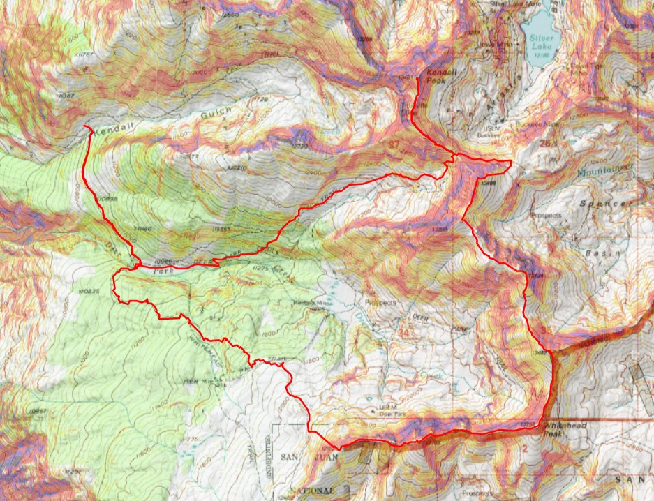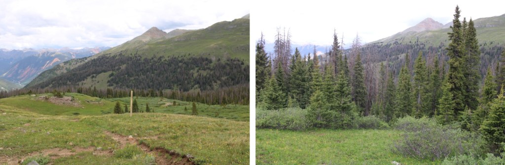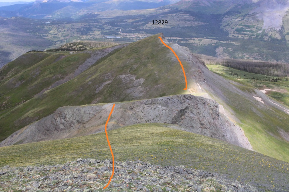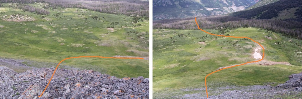 I continued west down the face of PT 12829. It was my goal to link up with the Whitehead Trail. I do not recommend this. Serious route finding is required. Instead, take one of the many trail that will take you back to the road you hiked in on. In any event, here’s my route down