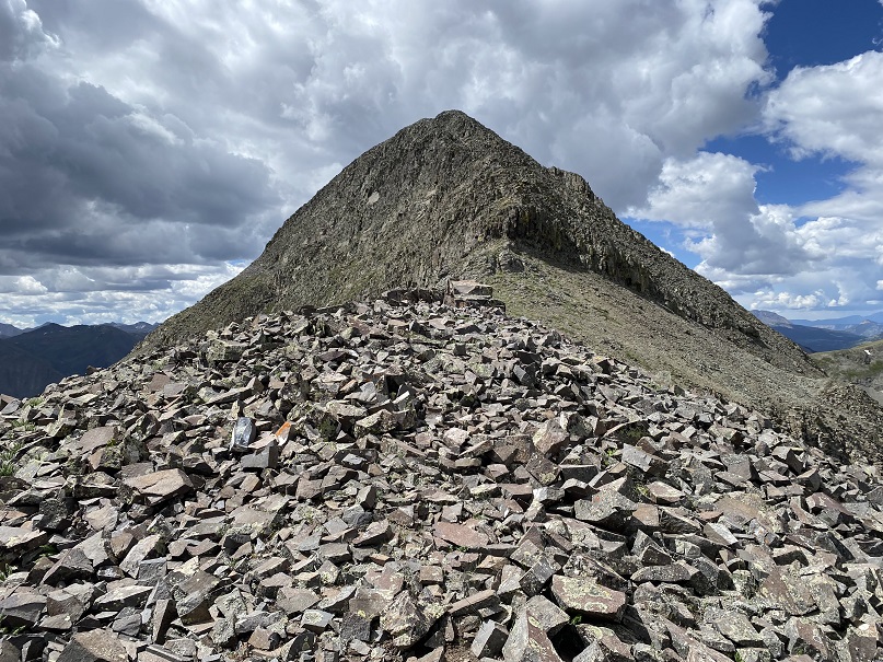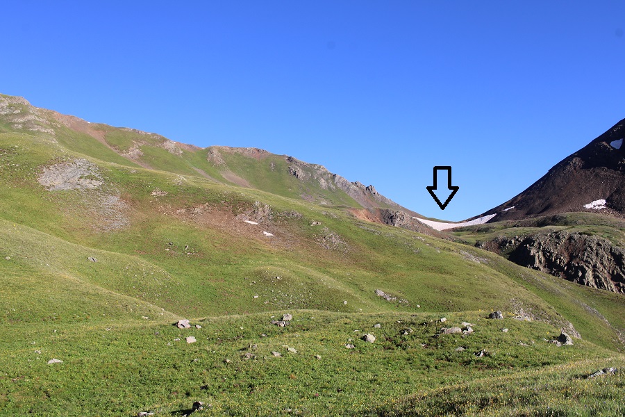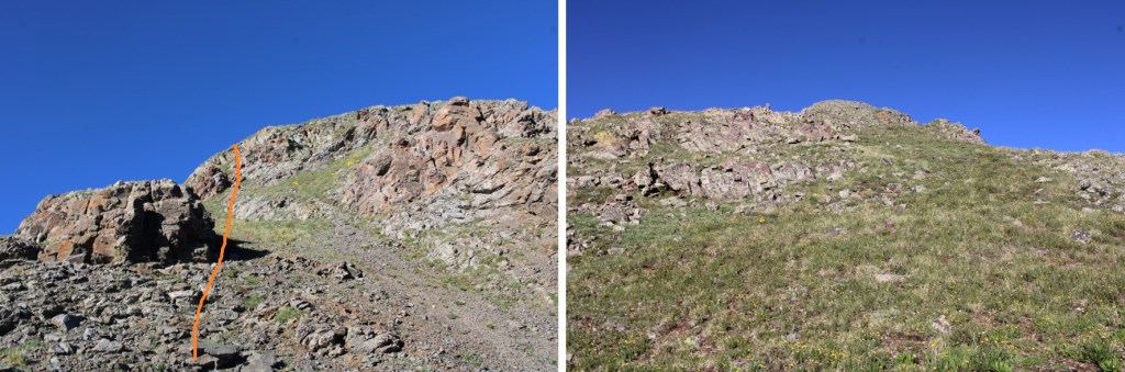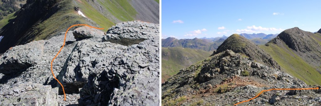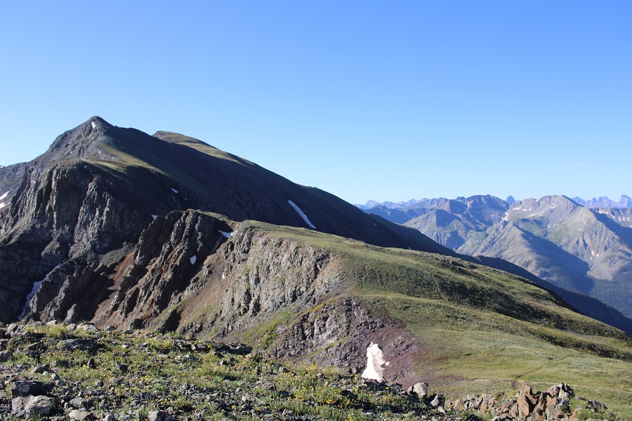There were a ton of bees and flies at the summit, so I didn’t stay long. I was making this a loop, and wanted to head north into the basin I’d hiked in, towards the South Fork Animas River. I wasn’t 100% sure this would work, but as I looked this morning from below I knew if I could get down the rocky area I’d be good to go. I headed south and followed the ridge. This was also class 3-easy 4, but much more stable and easier to navigate than the ridge I’d taken up. There are rocky chimneys to descend, but mostly tundra. If I were just doing Dome, this is the route I’d take up and down.