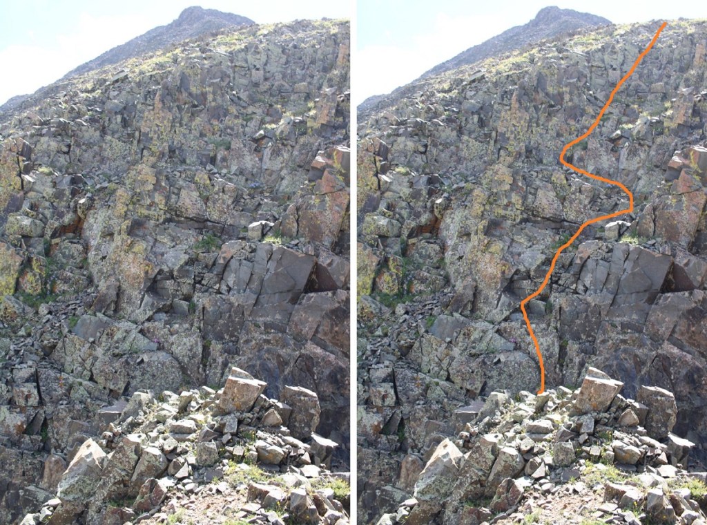 This is difficult class 3, easy class 4, and most of it is pick your own route. There were plenty of hand and footholds, but there was a lot of balancing involved, and not a lot of room. Very little margin for error. This is the route I took