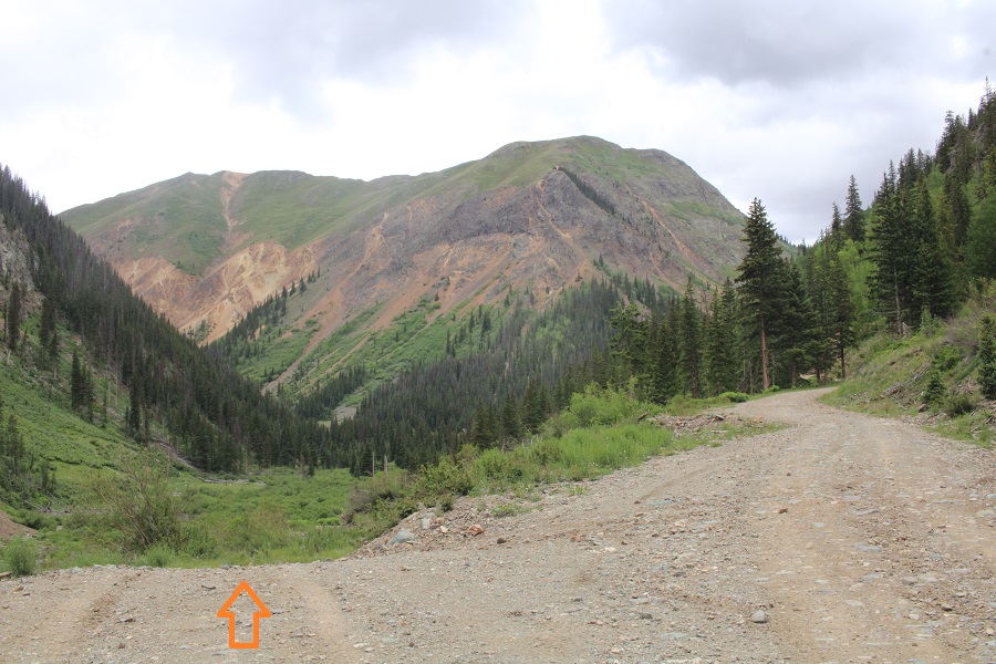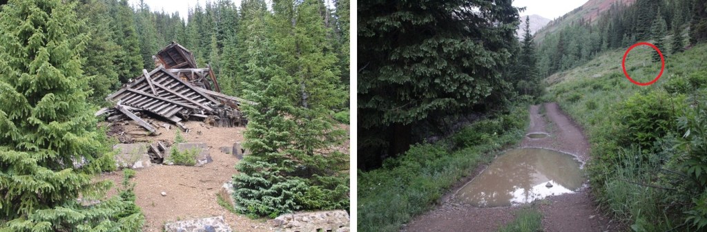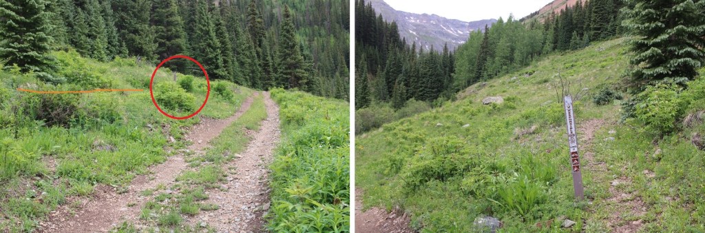 I crossed the creek, passed an abandoned mine, and the road curved. This is where the trail began. It’s an unnamed pack trail, and very difficult to follow. Don’t cross the creek.