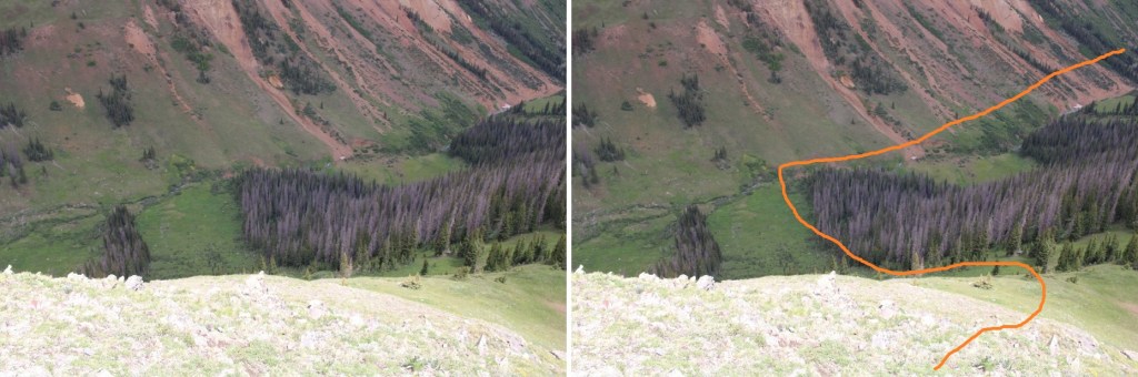 And noted now that I had a visual my intended decent route was going to need to be modified, as it cliffed out. I resolved to instead take a different ridge down, which looked like it ‘went’ and continued southwest to treeline. Once again, there wasn’t a consistent trail here, but I did come across game trails I utilized when available.