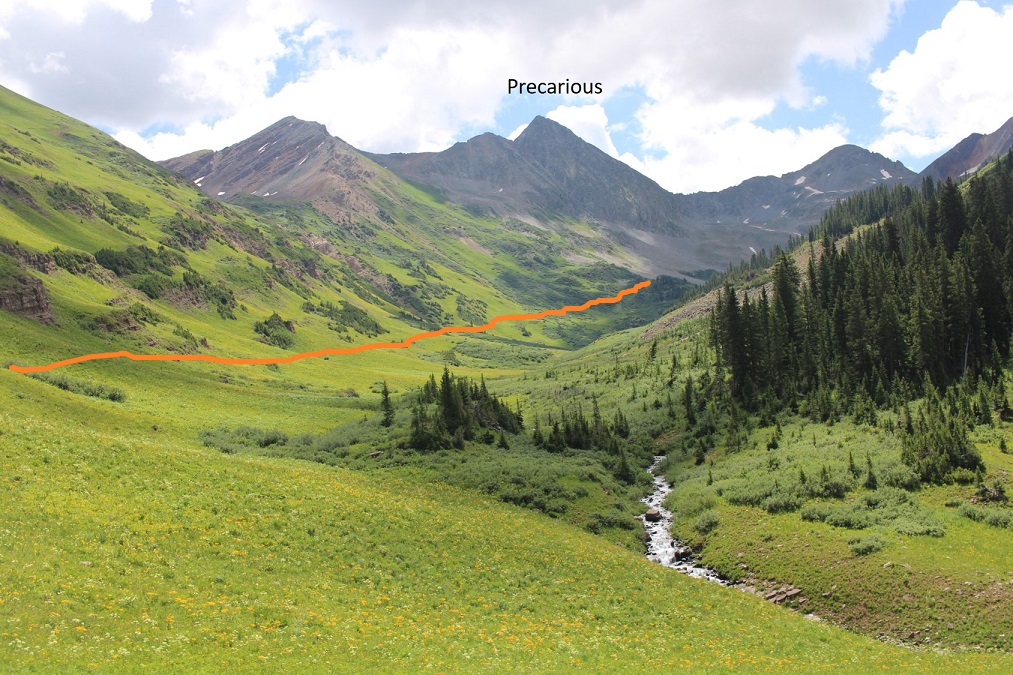 After hiking for 5.3 miles, I crossed a creek, and left the trail. I could see my route before me to Precarious’ access gully.