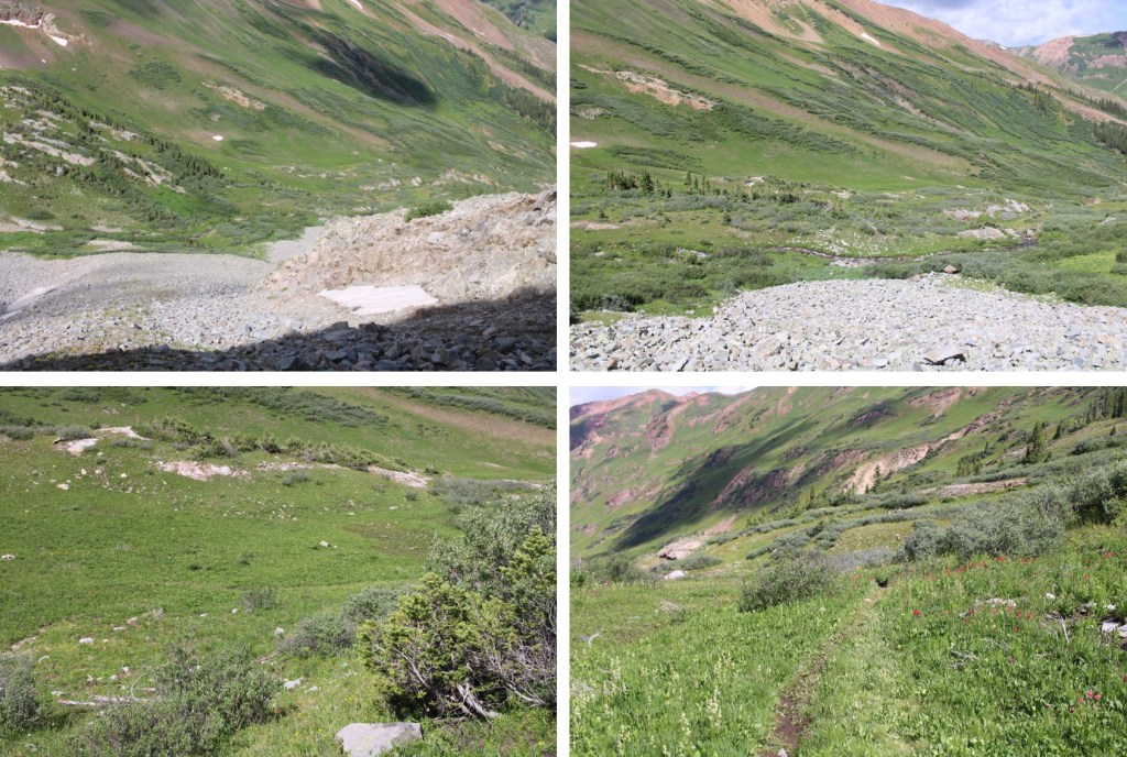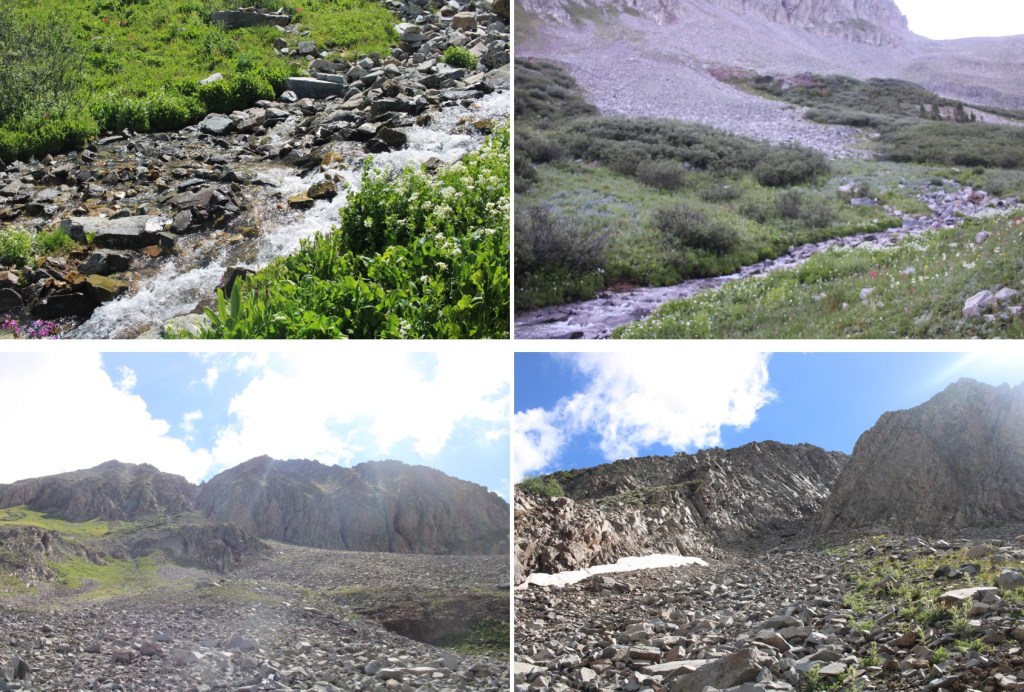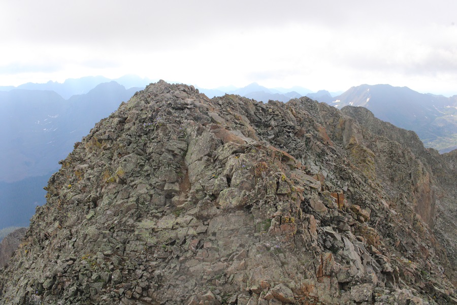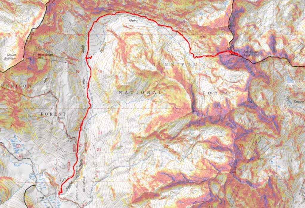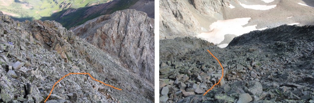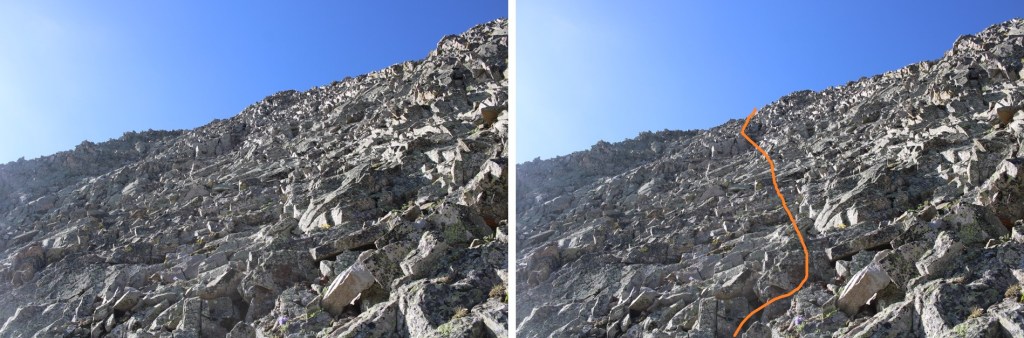 I aimed south, towards what looked like the ridge, but went too far up, where the route cliffed out. Instead, head east. At around 13190 there’s a path to go around the mountain. I had to descend about 50’