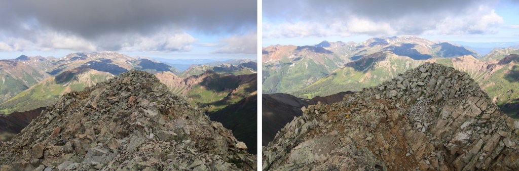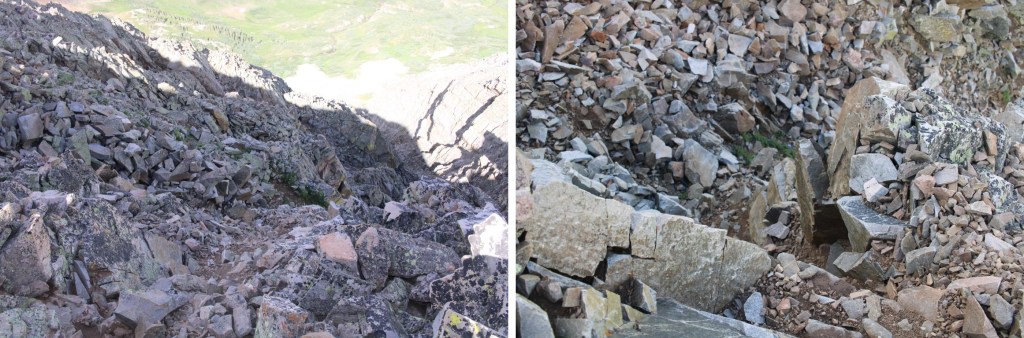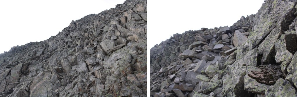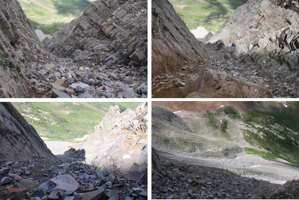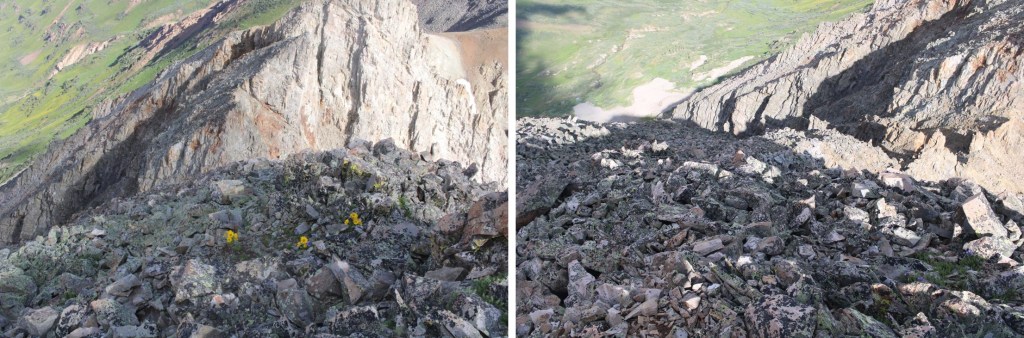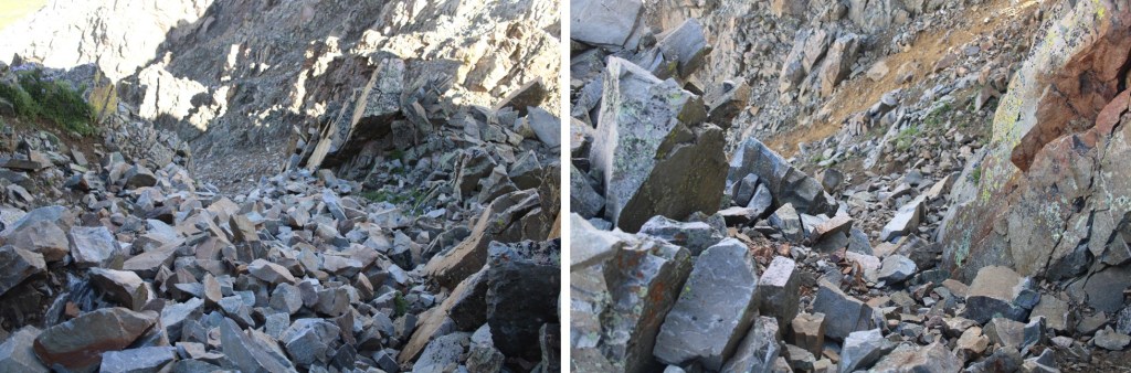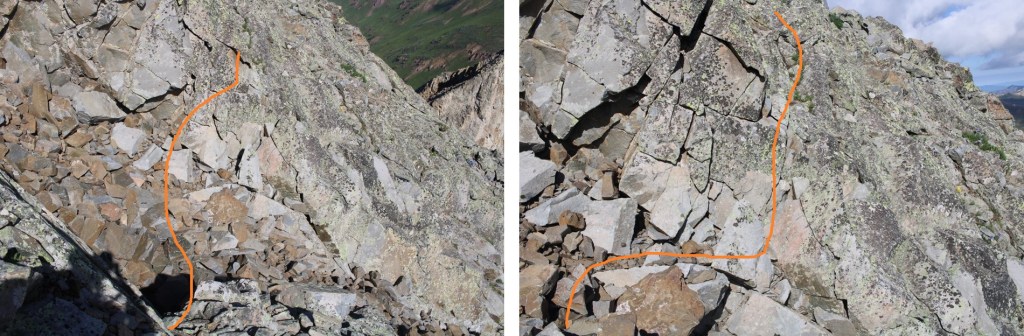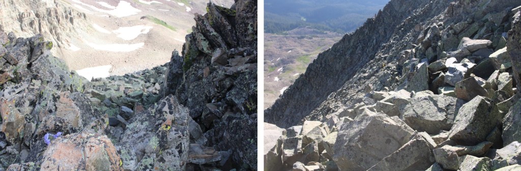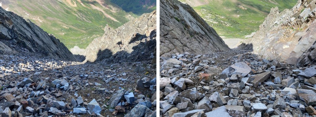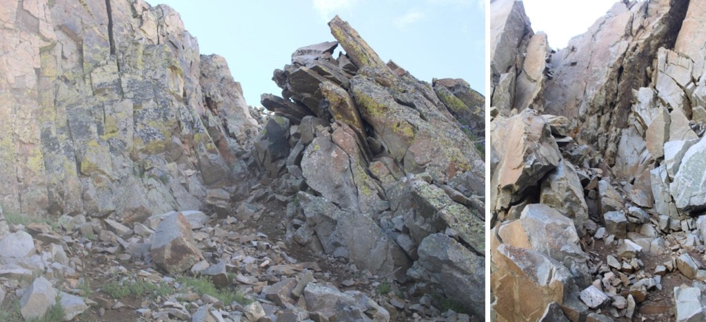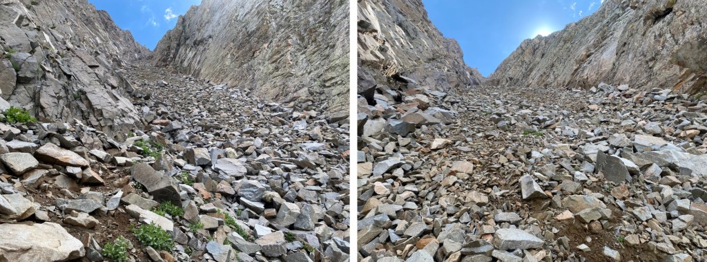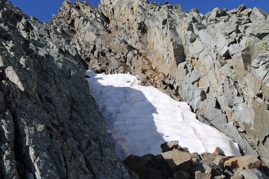 There are two ways to top out of the gully. I took the first one up, the last one down. If I were to do this again, I’d take the one closest to the top up and down, as it felt more secure. Here’s the one I took up, which still had snow in mid-July: